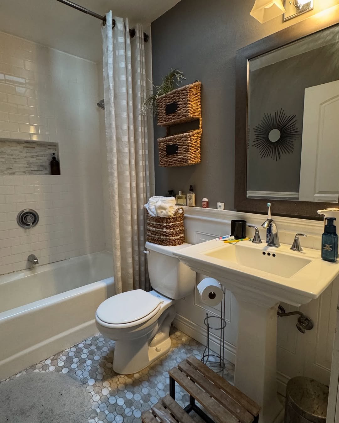 This is one of those bathrooms that feels real—in the best way. Neutral tones, practical storage, and cozy textures come together to create a space that actually works for daily life.