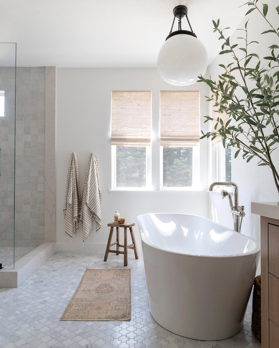 If bathrooms could breathe, this one would. Natural light, soft textures, and that freestanding tub create a space that feels open and relaxed.