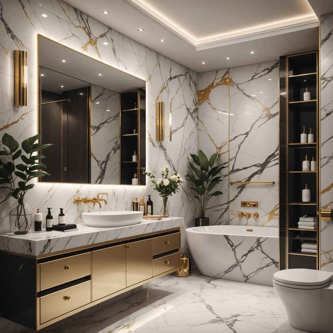 This one is pure drama—in a good way. Bold marble veining paired with gold accents gives the whole space that high-end, hotel-suite energy.