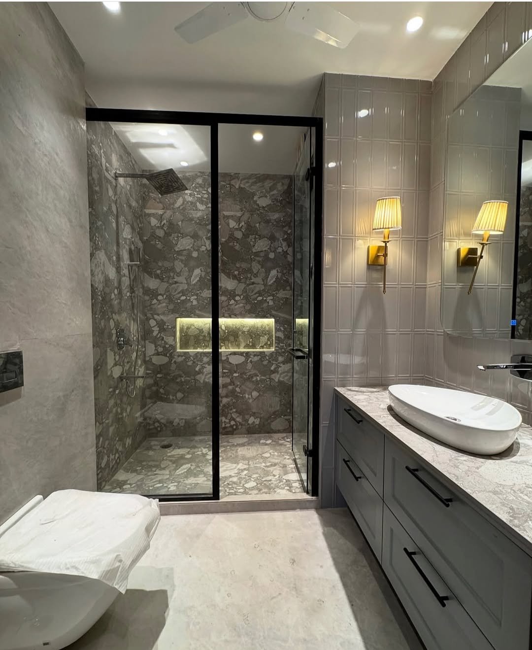This bathroom has that polished, high-end feel you’d expect from a luxury hotel. Clean lines, statement lighting, and a sleek glass shower all come together effortlessly.