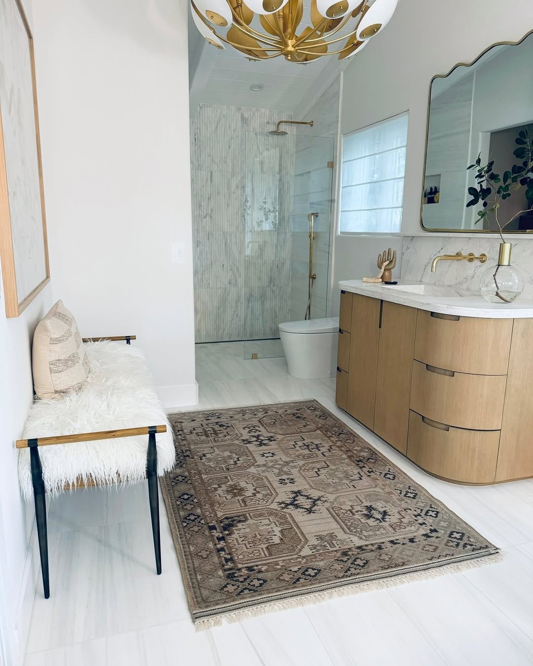 I love how it balances luxury with comfort—the bench, the rug, the soft shapes. It’s giving spa energy, but still feels like a home you’d want to linger in a little longer than necessary.