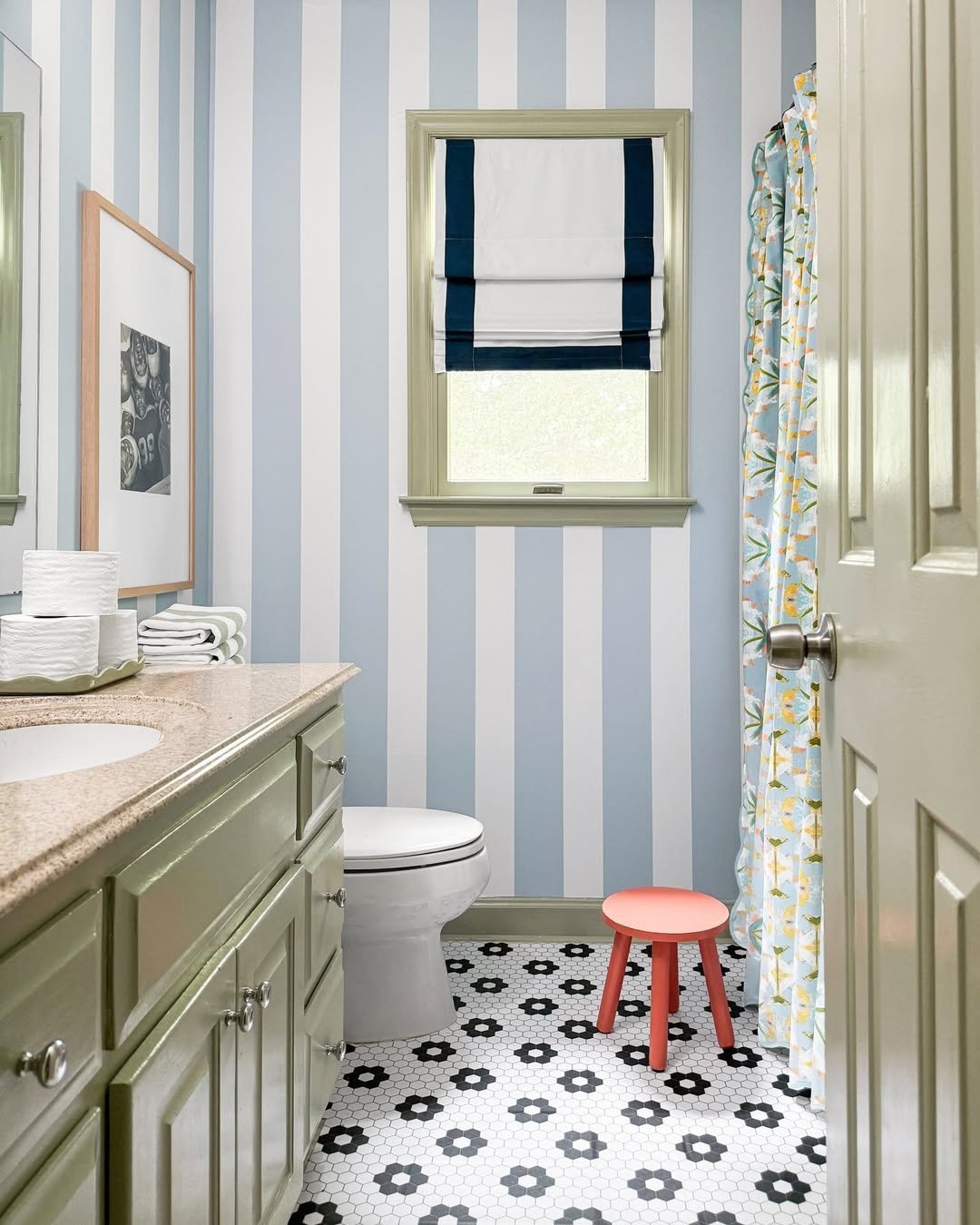 This one has personality—and it’s not afraid to show it. The striped wallpaper brings in a soft, retro vibe, while the patterned floor keeps things visually fun.