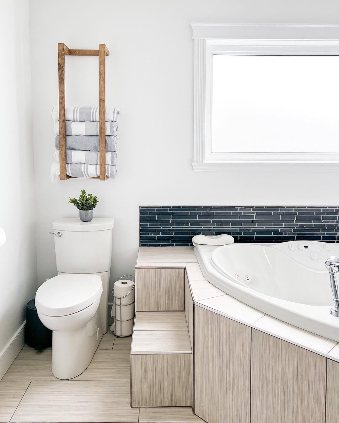 The built-in tub surround adds both storage and structure, making everything feel a bit more custom. It’s practical design, but still polished enough to feel like a glow-up.