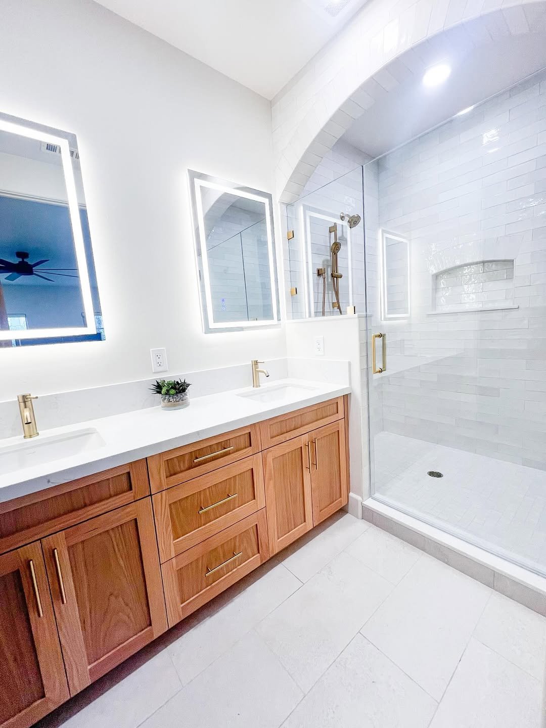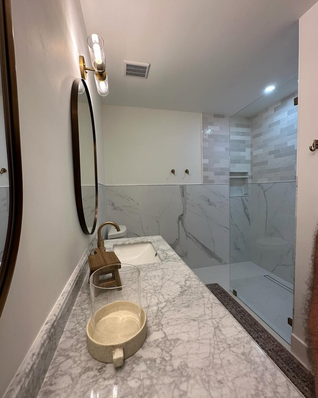 And those backlit mirrors? Instant upgrade. It’s the kind of bathroom that feels calming the second you walk in… like your stress just quietly clocks out.