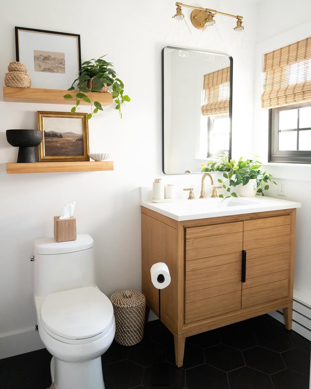 Clean, simple, and quietly beautiful. The light wood vanity and open shelving bring in just enough warmth to keep the space from feeling too minimal.