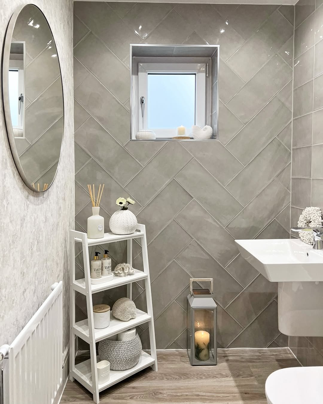 There’s something so satisfying about this mix of structured tile and soft decor. The shelf itself is simple, but paired with that grey-and-white palette, it instantly feels elevated. It’s clean, modern, and just cozy enough with those little styling touches.