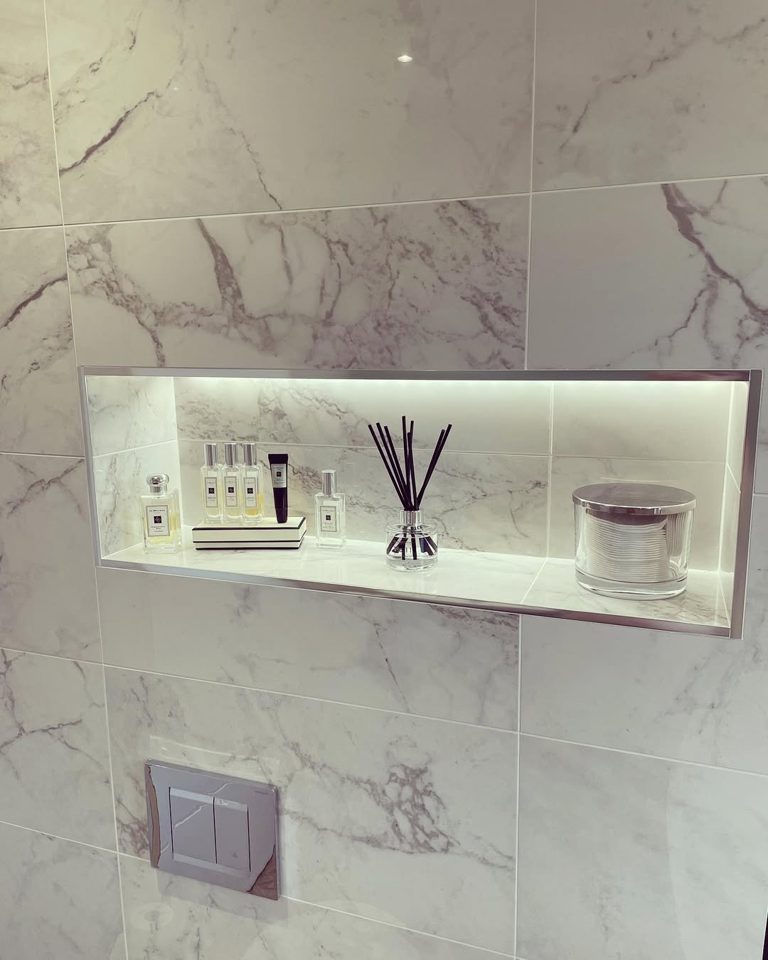 Now this is sleek. The built-in niche with soft lighting instantly upgrades the whole bathroom into something that feels custom and high-end. It’s clean, modern, and super practical.
