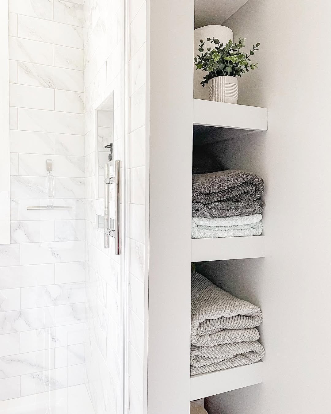 This is the kind of storage that feels like it was always meant to be there. The built-in niche beside the shower keeps towels neatly stacked while still looking sleek and intentional—no bulky cabinets, no wasted space. And that crisp white palette? It makes everything feel fresh, airy, and just a little bit spa-like.