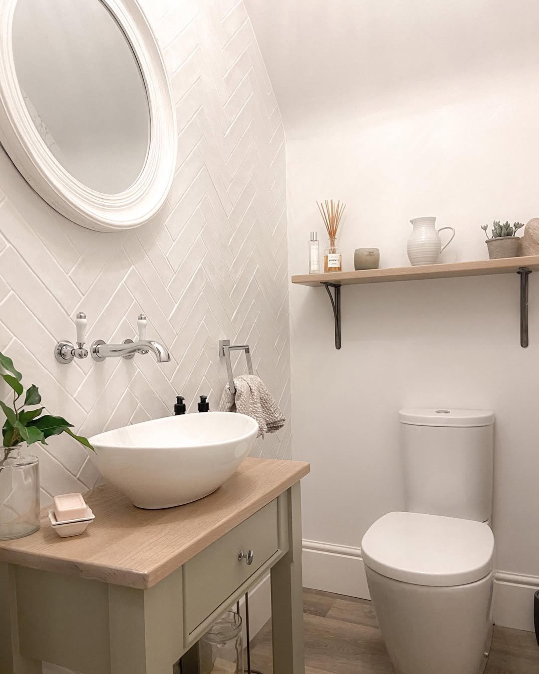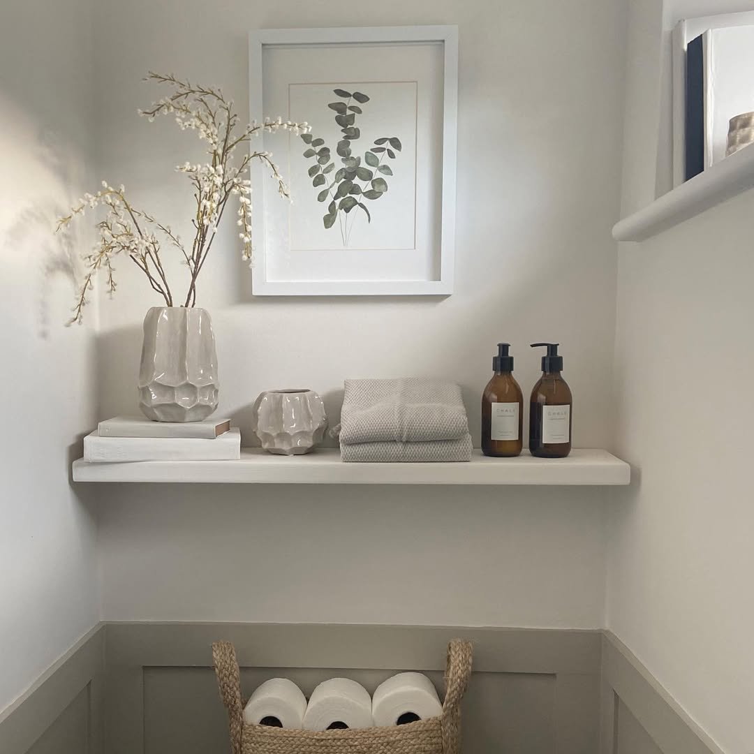 There’s something really peaceful about this one. The single floating shelf keeps things light and uncluttered, while the soft neutral palette makes the whole space feel bigger and brighter.