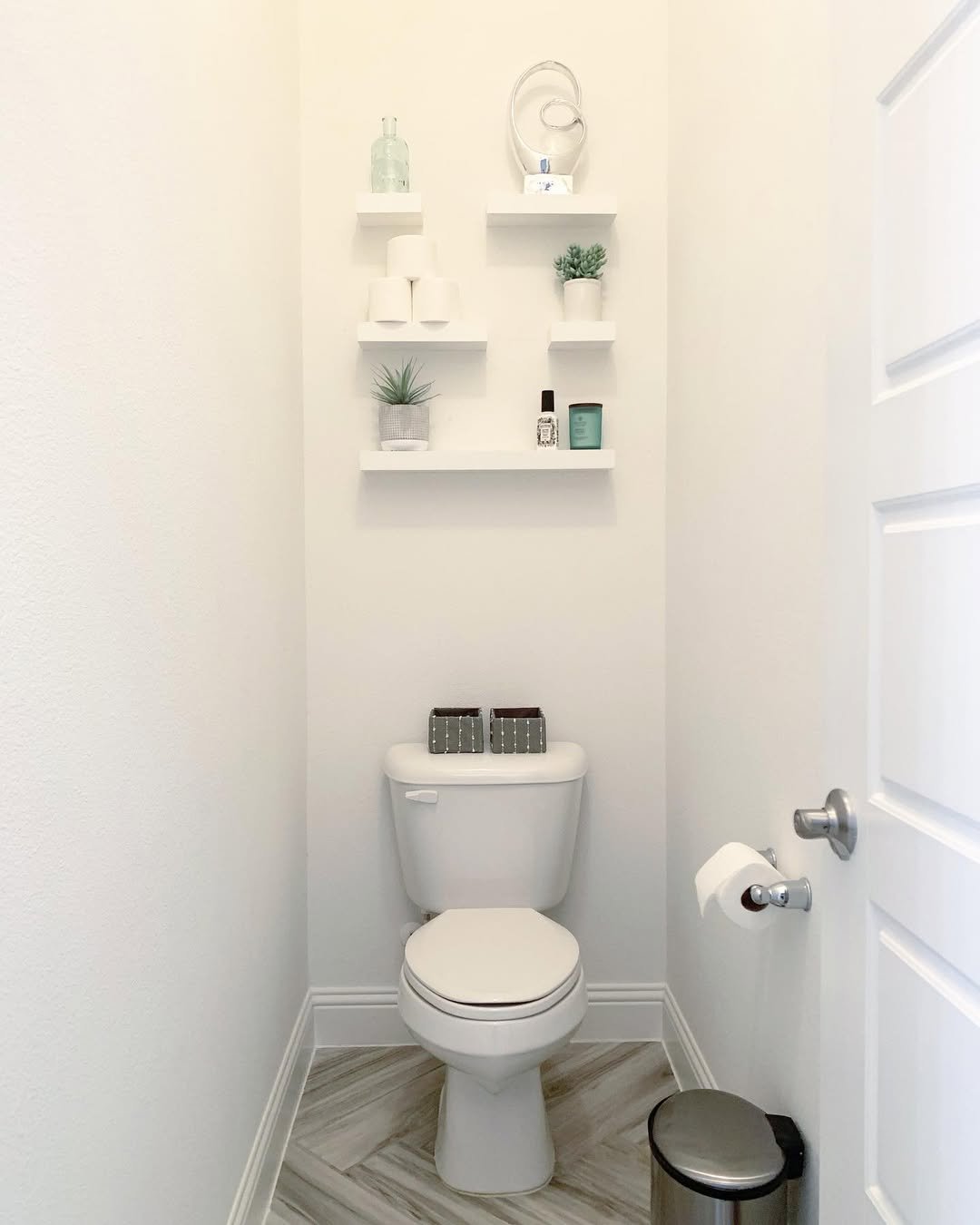 This setup is proof that even the tiniest bathroom corner can have main-character energy. Those small floating shelves stacked vertically feel super intentional, almost like a gallery wall—but make it functional. Everything has its place, and nothing feels crammed.