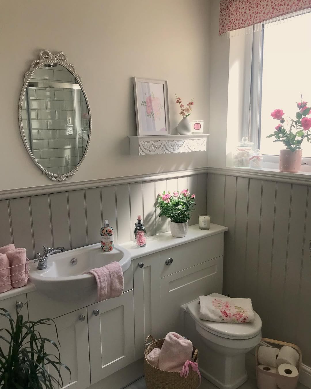 This one feels like a soft Sunday morning. The pastel tones, delicate florals, and that vintage-style shelf create such a gentle, lived-in charm. It’s not trying too hard—it just is cozy.