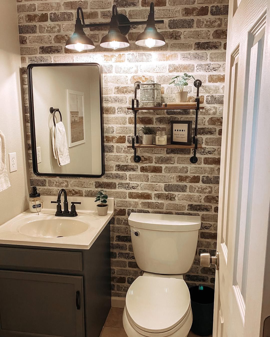 There’s something about a brick wall that just hits. Add industrial-style shelving on top, and suddenly your bathroom has character. This setup feels bold, textured, and a little edgy—in the best way.