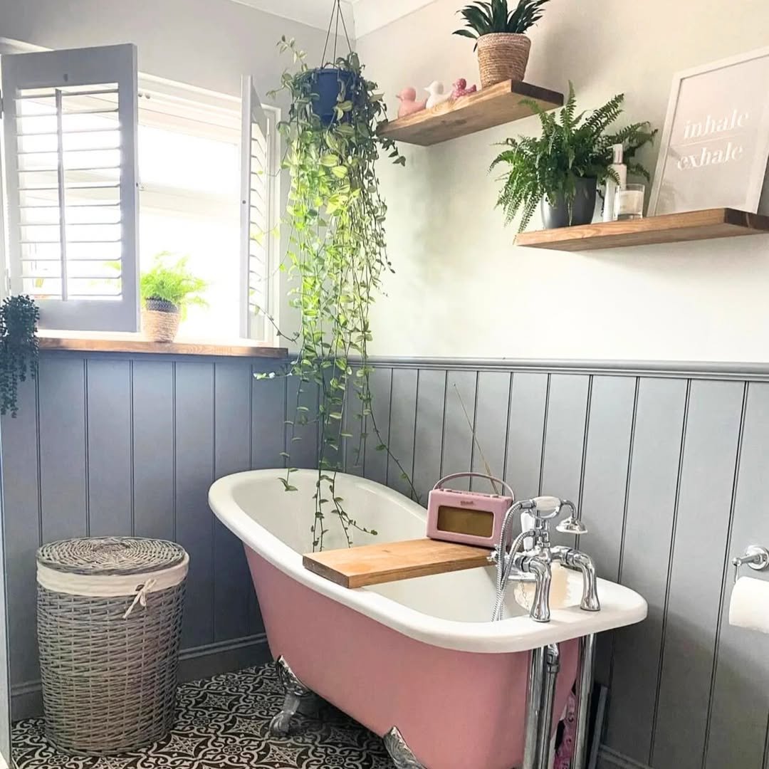 This one feels alive. The mix of floating shelves and trailing plants creates such a soft, fresh atmosphere—like your bathroom just took a deep breath.