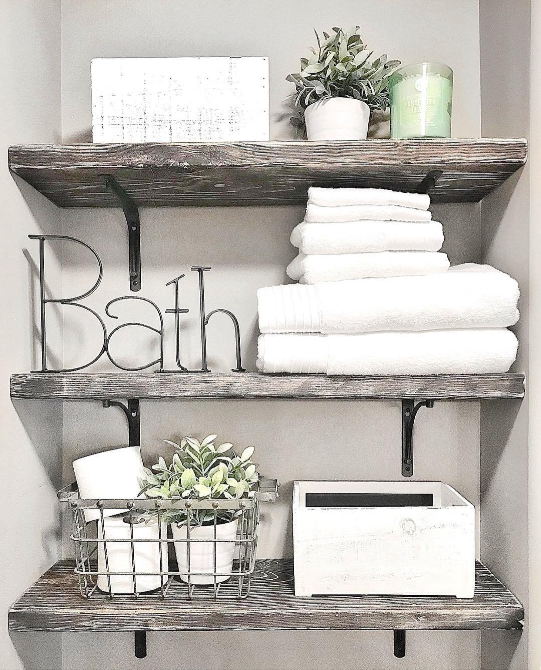 This one is pure farmhouse goodness. Thick wooden shelves, dark brackets, and those neatly folded white towels—it’s giving Pinterest board come to life.