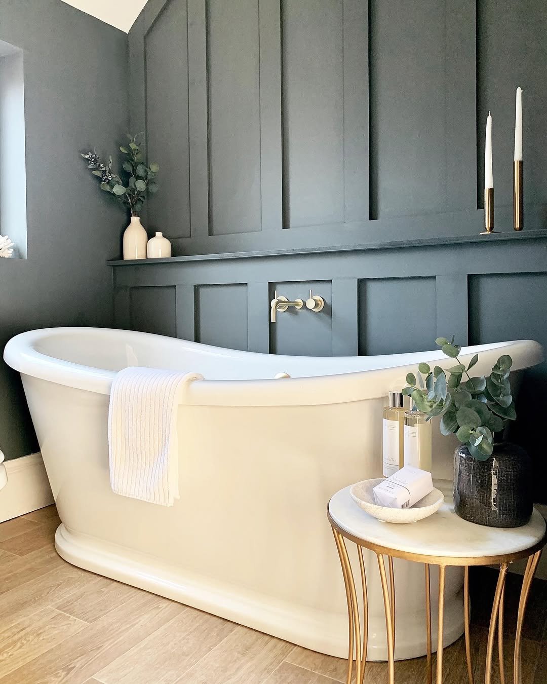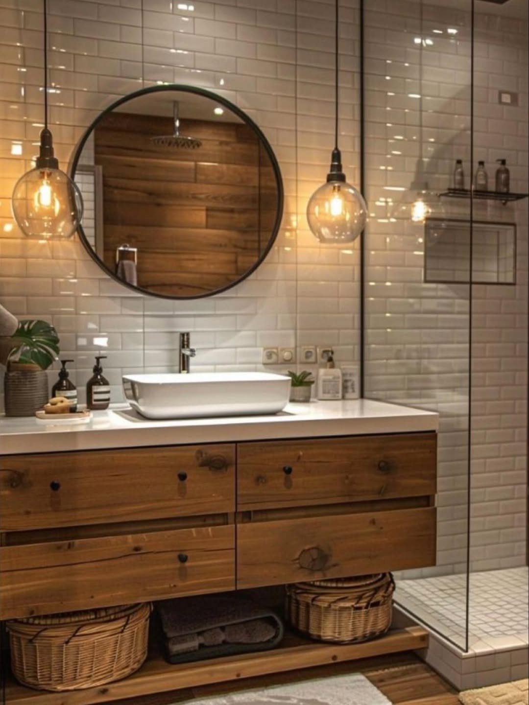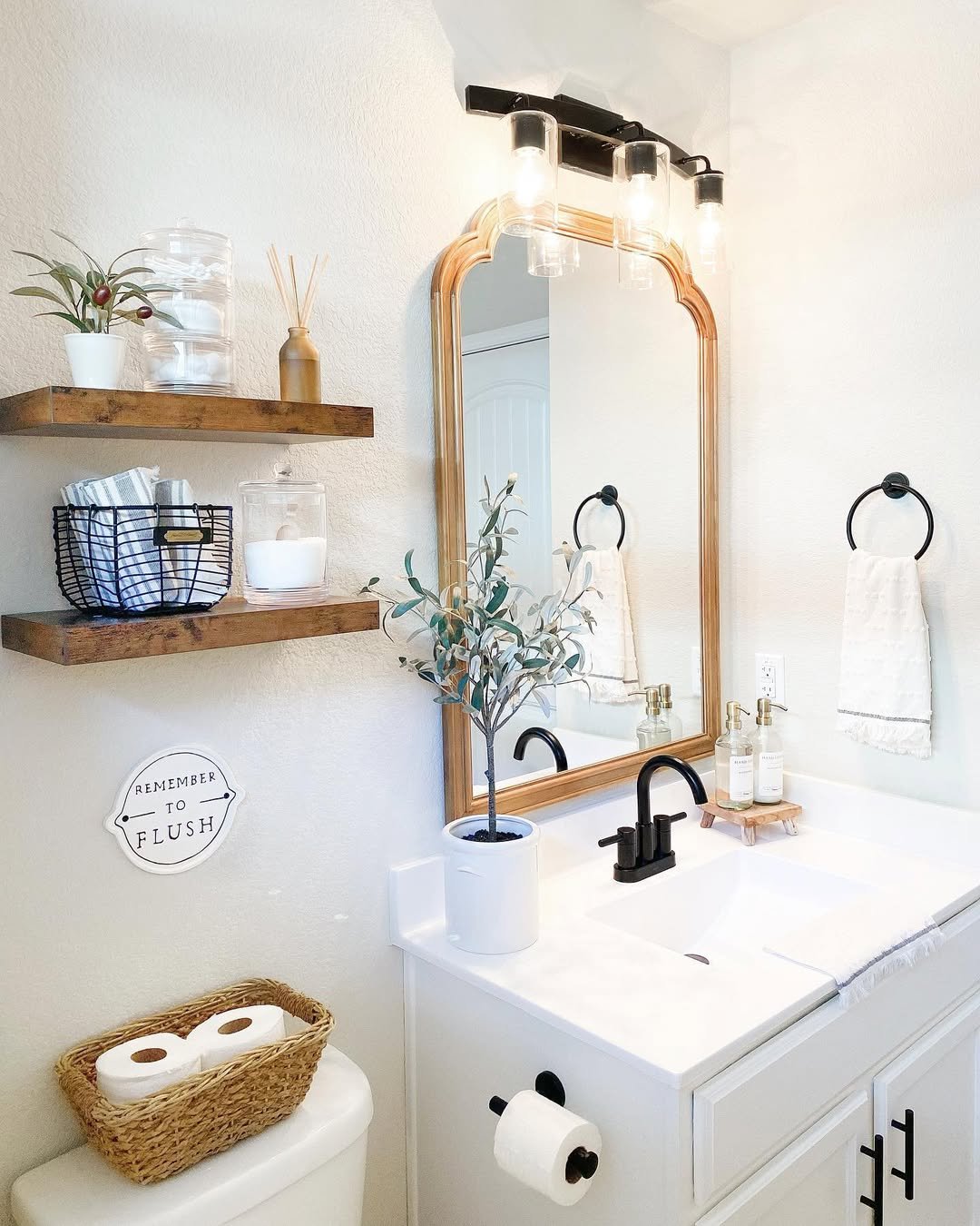 This one feels instantly welcoming. The wooden shelves paired with soft lighting and that gold-framed mirror create a cozy, lived-in vibe that still feels polished. It’s the kind of bathroom you actually want to spend time in.