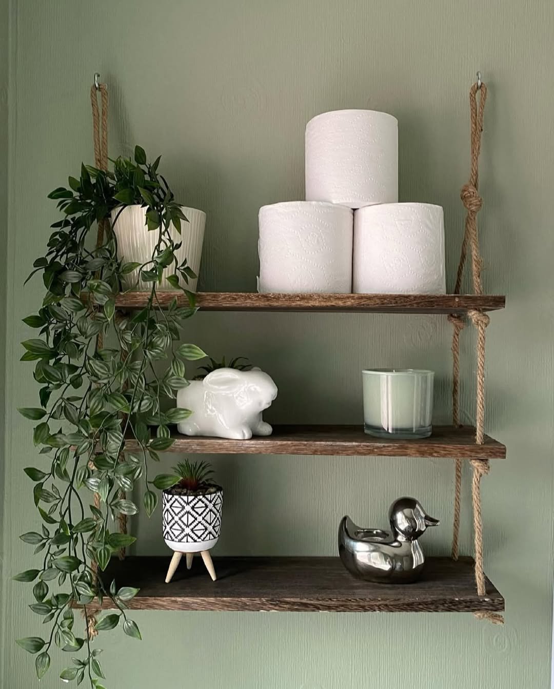 Okay, this one has personality. The rope-hung shelves instantly add that handmade, slightly rustic vibe that feels warm and inviting. Paired with the sage green wall? It’s a whole mood.