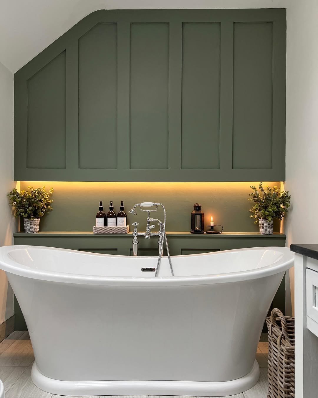 Now this… this is a moment. The deep green paneling paired with warm under-shelf lighting turns a simple shelf into a full-on feature wall. It’s dramatic, but still calm—like a luxury spa with personality.