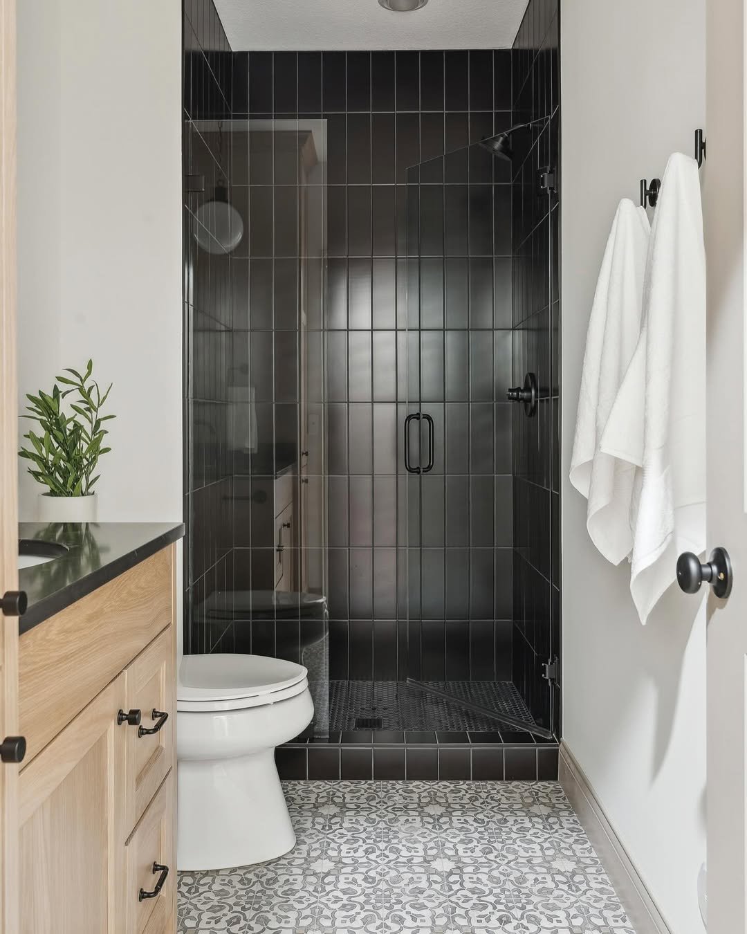 This shower is giving moody, modern, and just a little bit dramatic—in the best way. Those matte black tiles wrap the entire space like a cocoon, instantly making it feel sleek and intentional. Paired with the patterned floor outside, it creates this perfect contrast that keeps things from feeling too heavy.