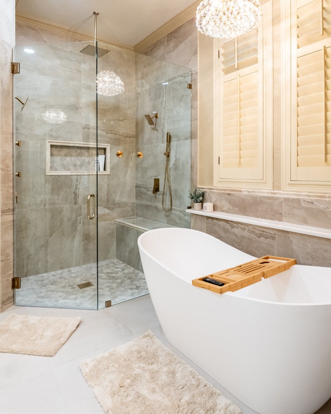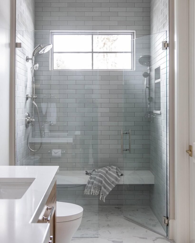 This one is all about quiet elegance. The soft gray subway tiles paired with that built-in bench create a space that feels both functional and relaxing. Nothing flashy—just really good design doing its thing.