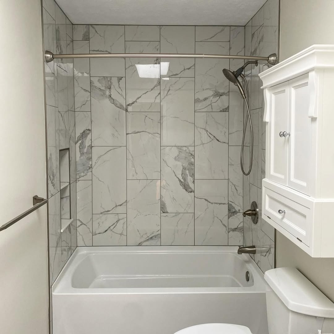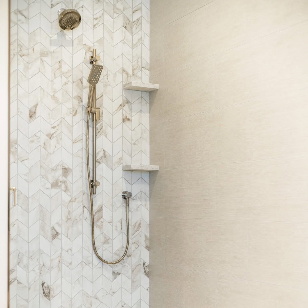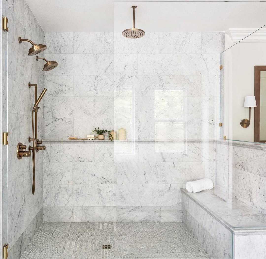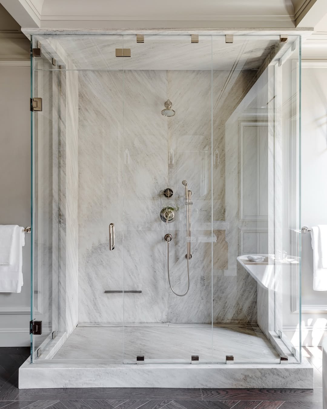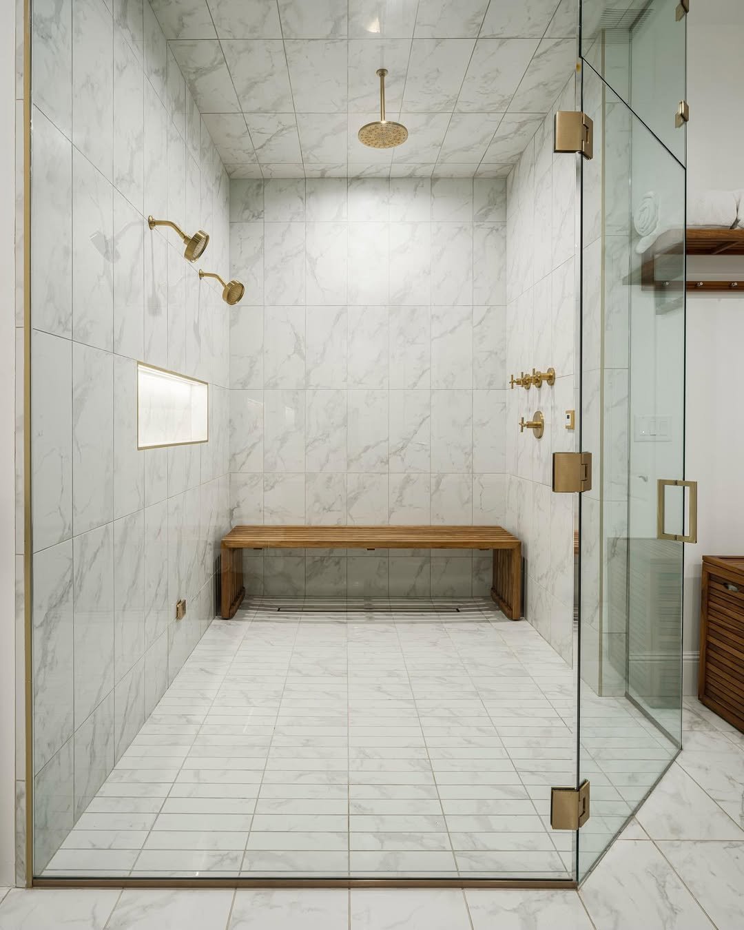 This shower keeps things classic—and honestly, that’s exactly why it works. The large-format marble tiles give you that high-end look without overwhelming the space, and the soft gray veining adds just enough movement to keep it from feeling flat.