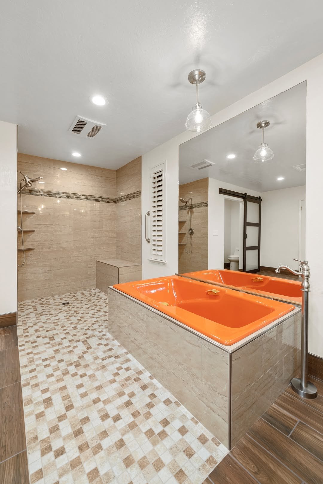 This setup is basically a dream for anyone who loves space. You’ve got a full walk-in shower area paired with a bold, eye-catching tub—yes, that orange is definitely making a statement.