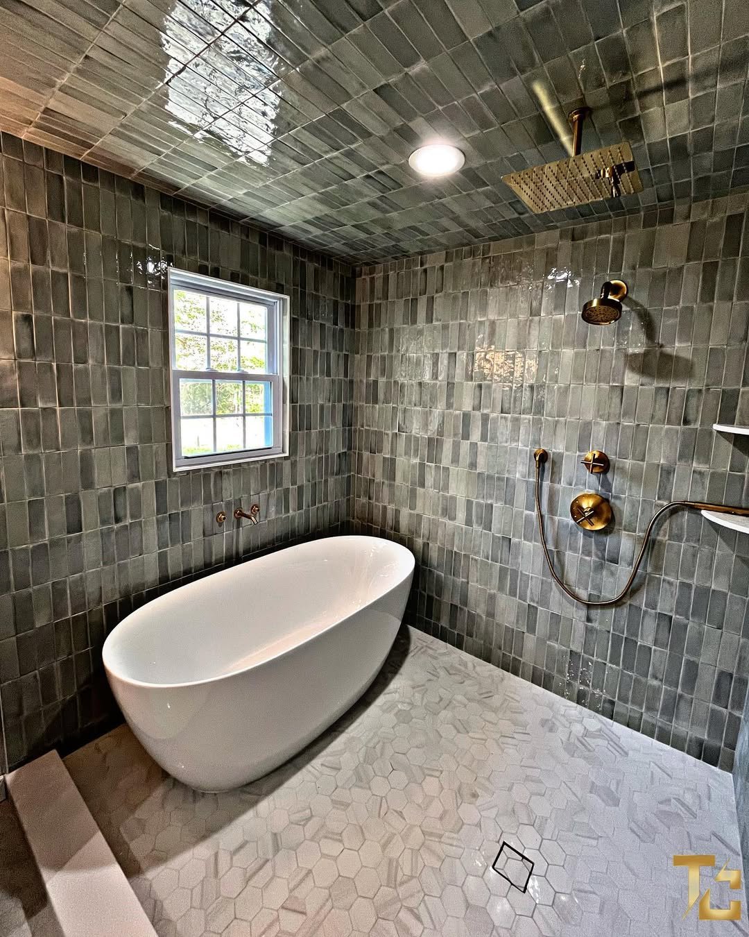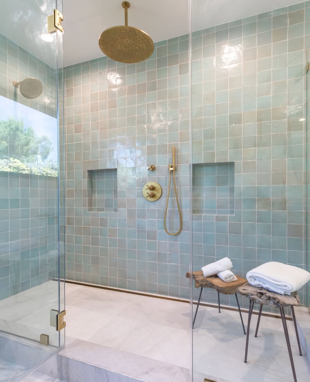 This one feels like stepping into a luxury resort somewhere coastal. The soft aqua tiles catch the light so beautifully, giving that subtle shimmer that makes everything feel calm and airy. And that oversized rainfall showerhead in warm brass? Instant spa vibes.