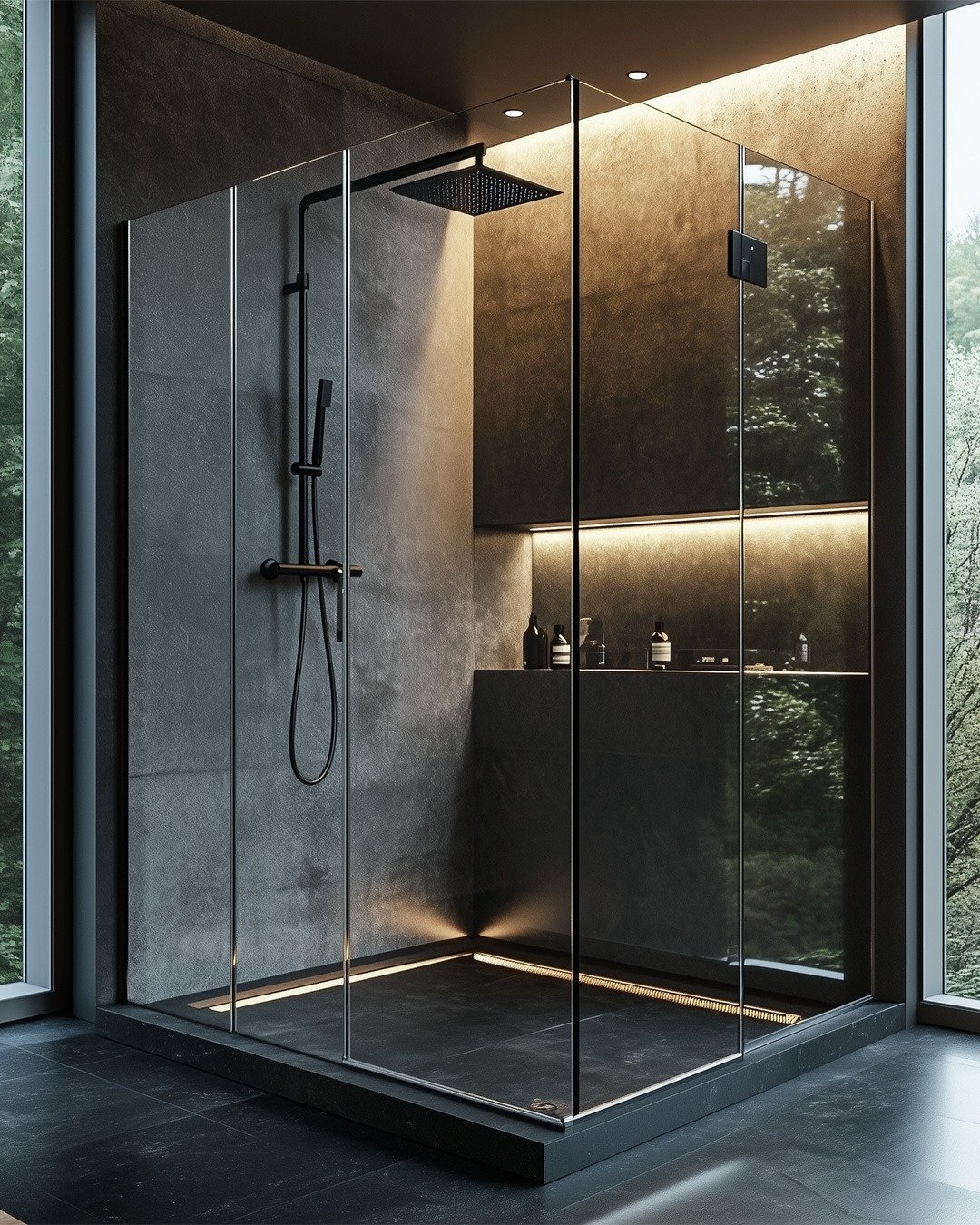 This shower is pure mood—in the best way. Dark tones, sleek lines, and that soft backlighting create a space that feels ultra-modern and a little bit cinematic.