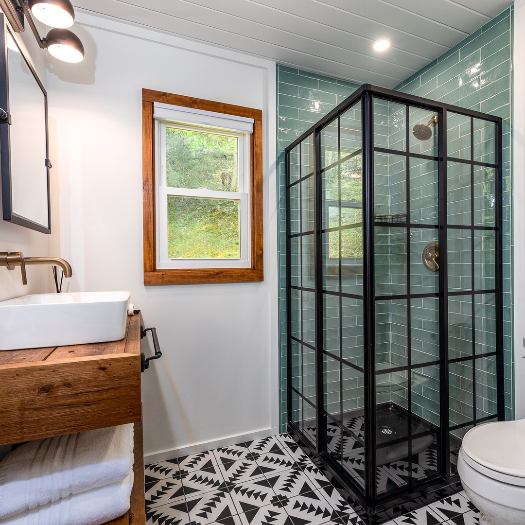 This one has that cool industrial edge without going full warehouse. The black grid shower frame adds structure and personality, especially against those soft green tiles in the background.