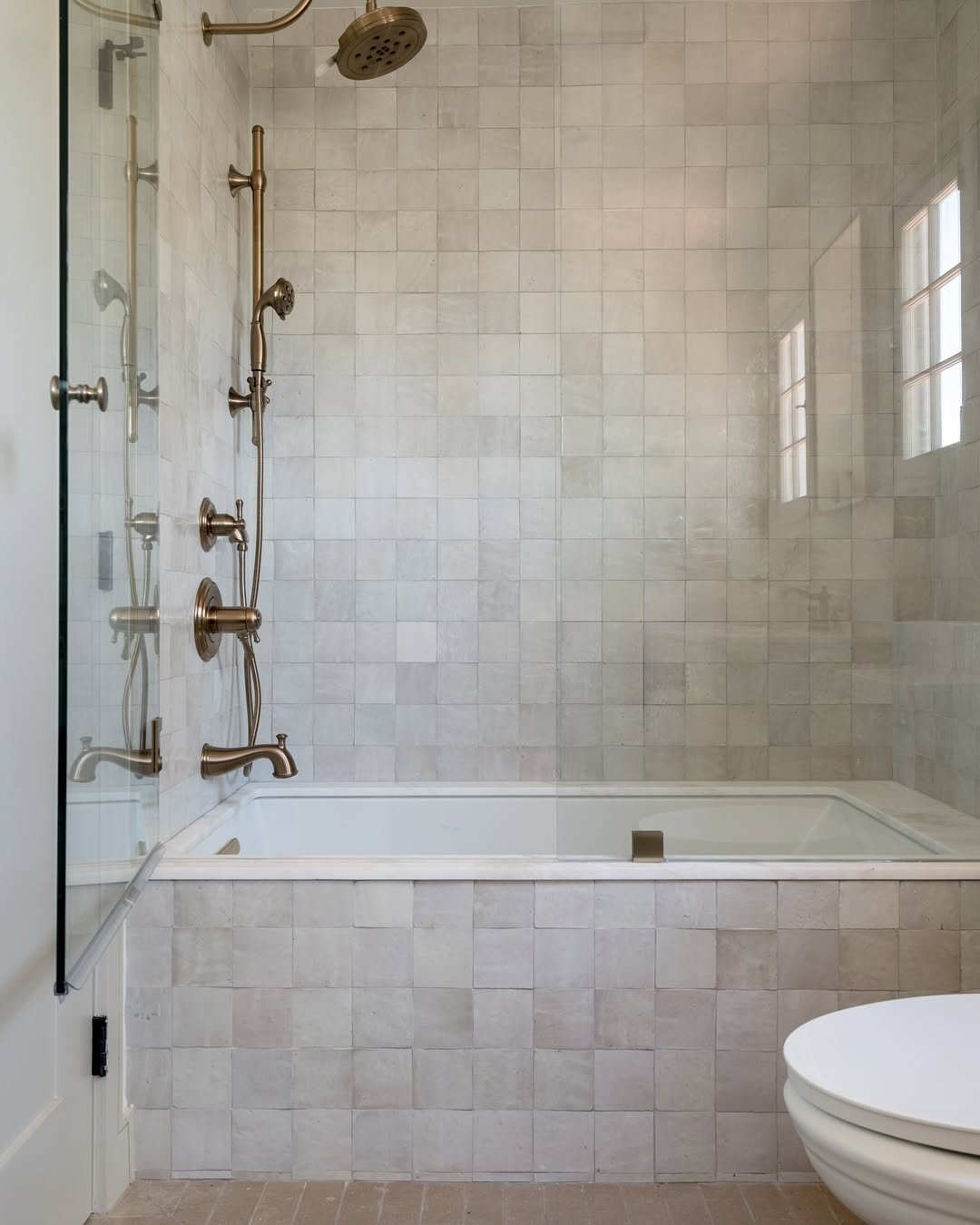 And paired with those gold fixtures, it instantly levels up. It’s proof that you don’t need crazy colors—just a smart pattern and the right accents to make a shower feel designer.