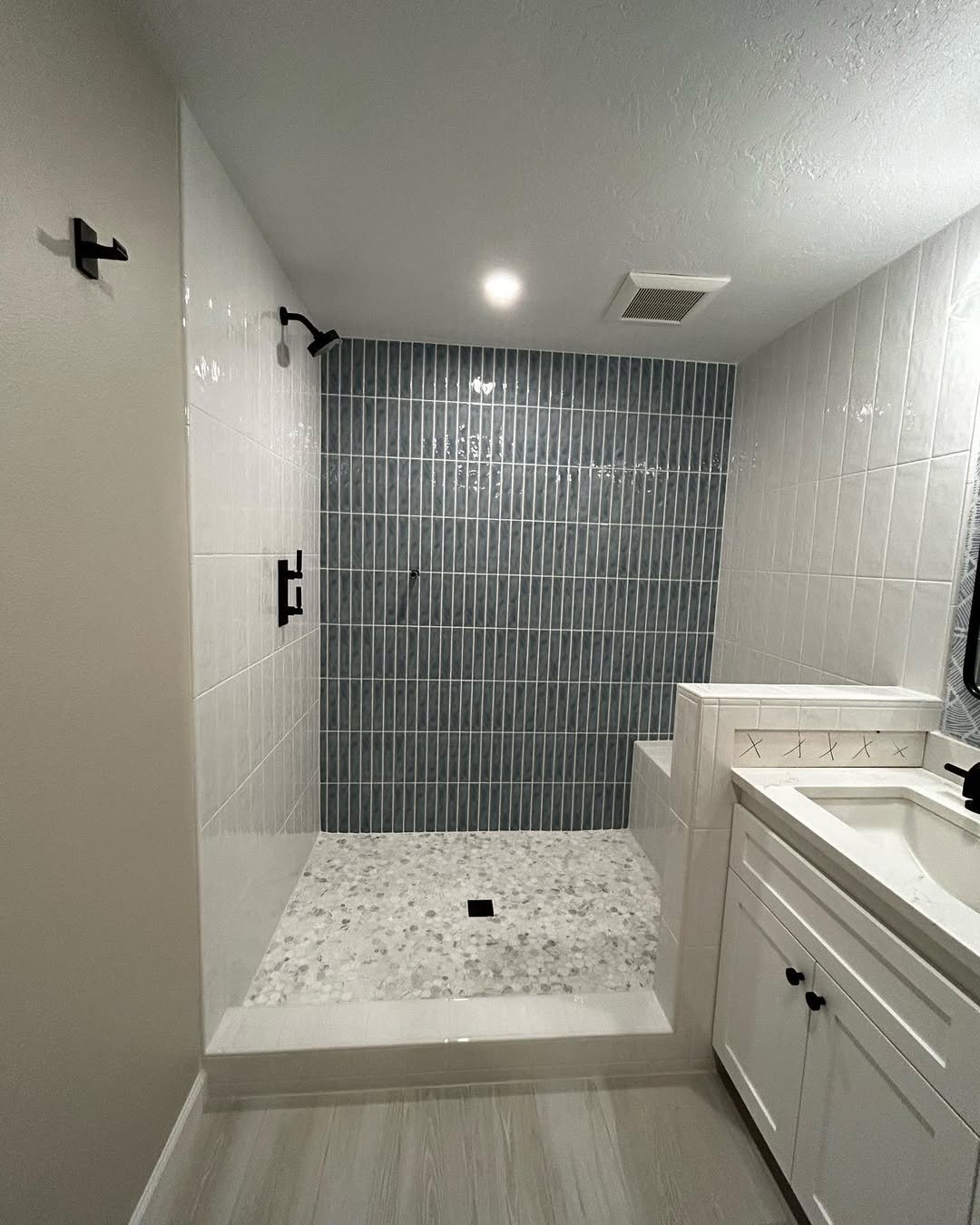 Here’s where texture really takes the spotlight. That vertical tile feature wall instantly draws your eye, while the rest of the space keeps things calm and balanced with larger neutral tiles. It’s a subtle statement—but a smart one.