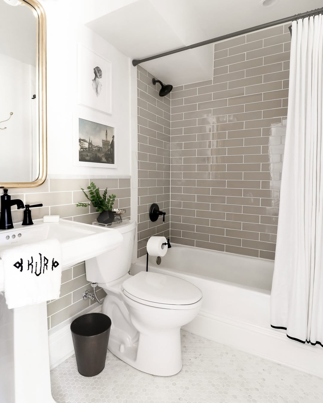 This one proves that simple doesn’t have to mean boring. The soft beige subway tiles bring warmth to an otherwise crisp white bathroom, creating a space that feels clean but still a little cozy. And those black fixtures? Just enough contrast to give it personality without overpowering the look.