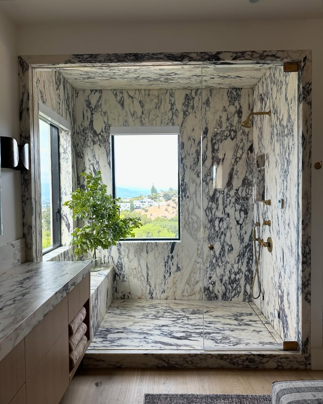 What makes it even better is the contrast between the natural light and the dramatic stone. It’s luxurious, yes—but also grounded and calming. Like a private spa with a view you don’t want to leave.