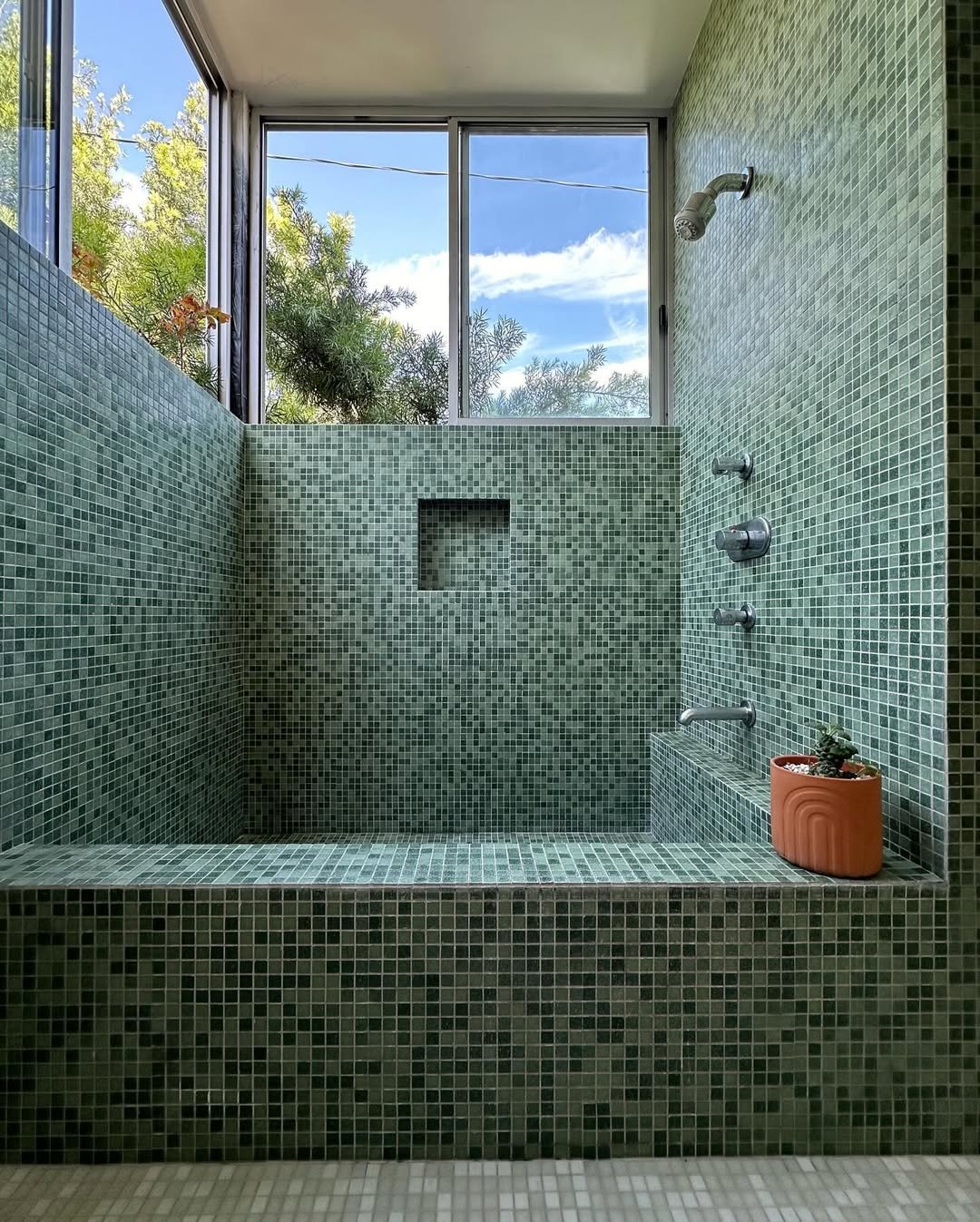 Okay, this one feels like a hidden retreat. The green mosaic tiles wrap the entire space, creating this immersive, almost outdoor-like vibe—especially with that window letting in natural light.