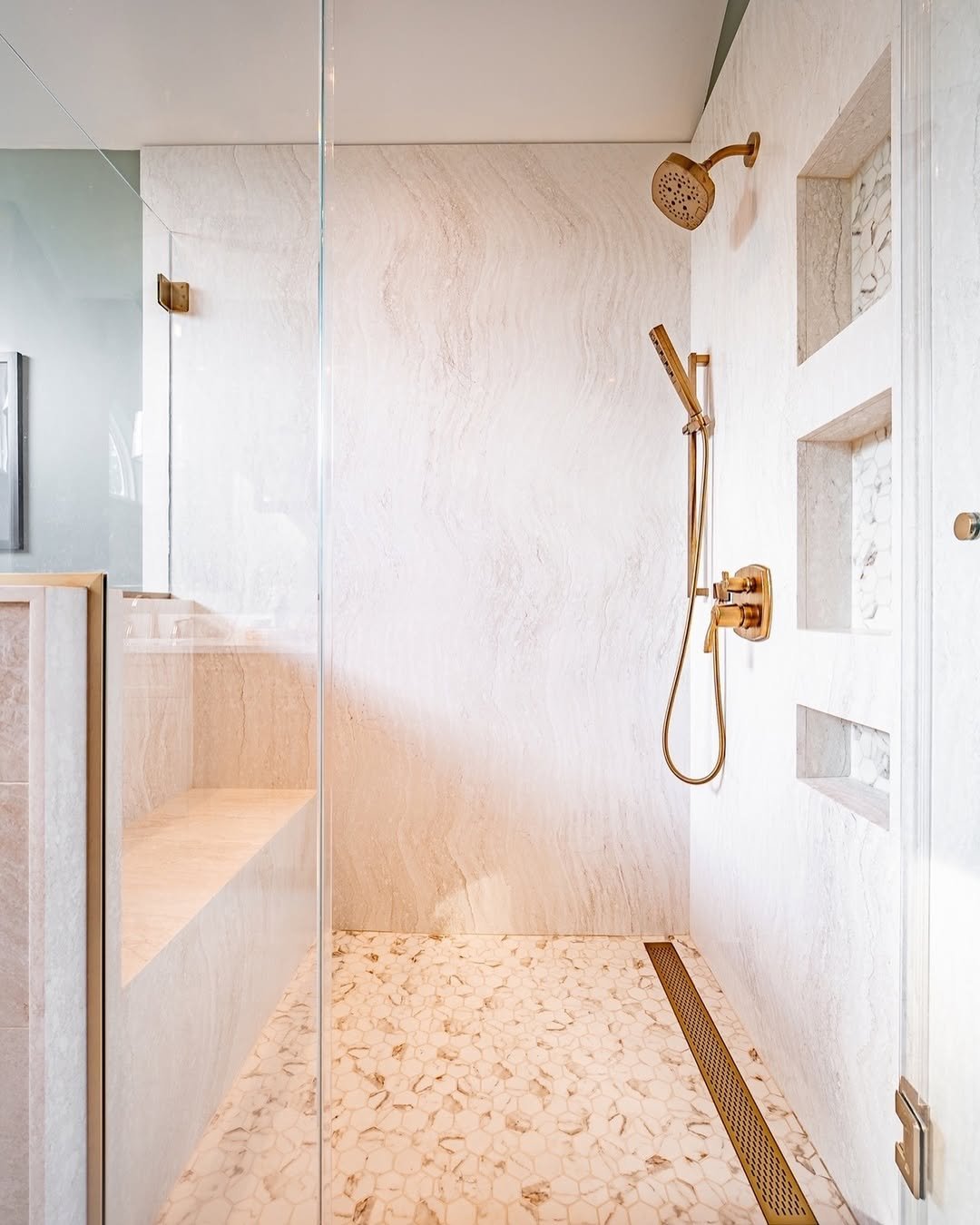 This shower leans into that “less but better” philosophy, and it absolutely delivers. The creamy stone walls paired with warm brass fixtures create a soft, elevated look that feels both modern and timeless. Nothing is loud, but everything is beautiful.