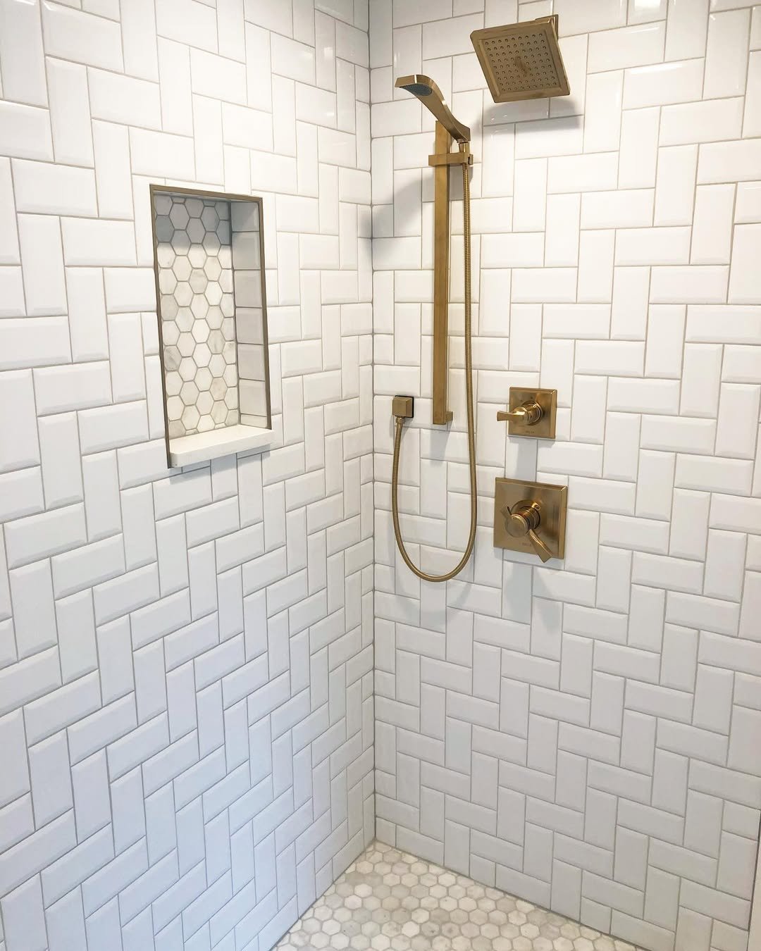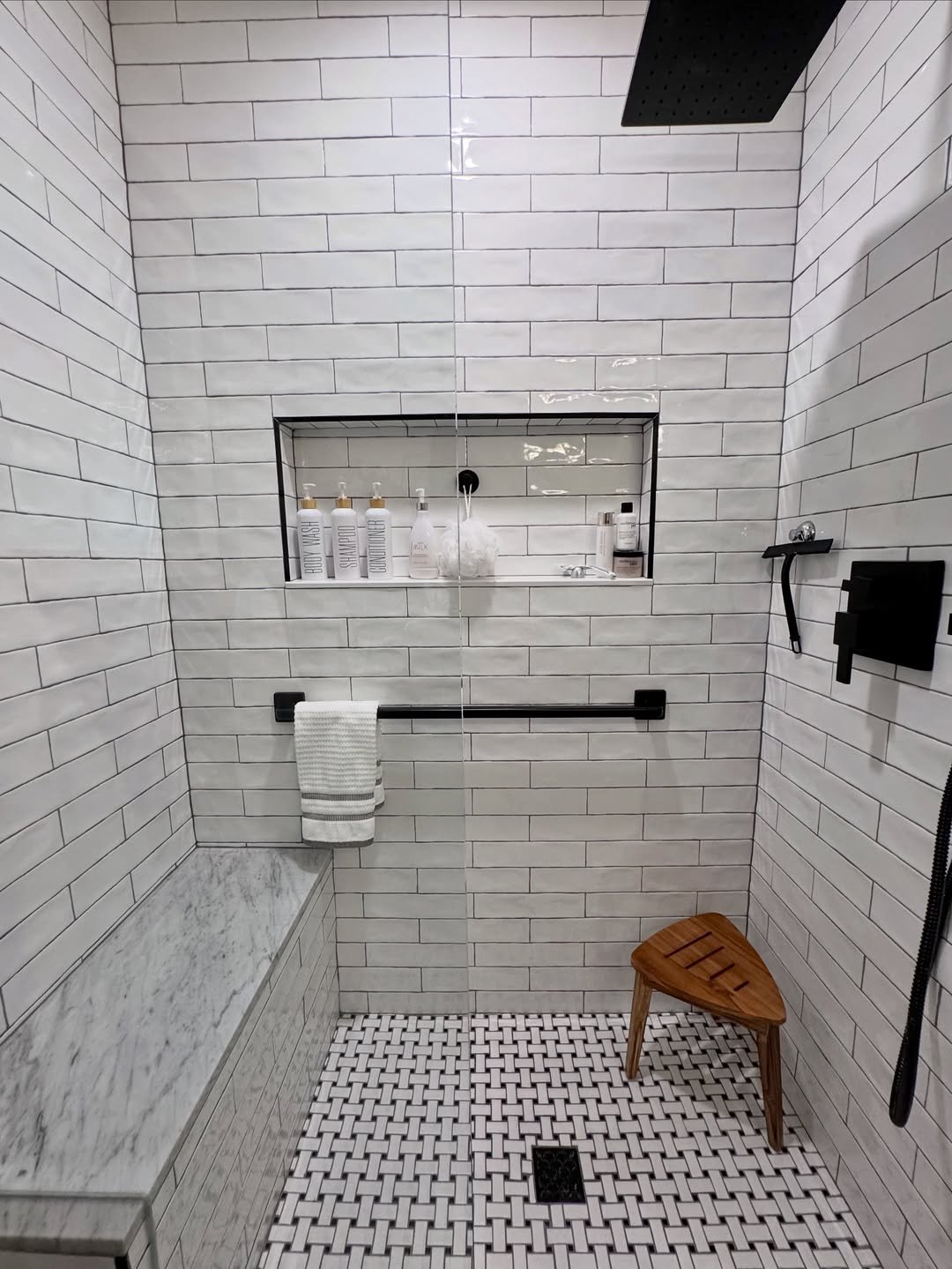 This is one of those combos that just never misses. Clean white subway tiles on the walls paired with a basketweave floor—it’s structured, timeless, and quietly detailed.