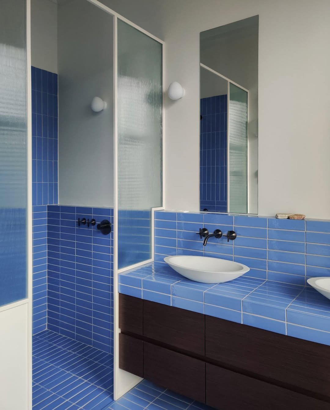 This deep blue tile wraps the vanity and shower in one continuous move, and honestly—it’s kind of addictive to look at.