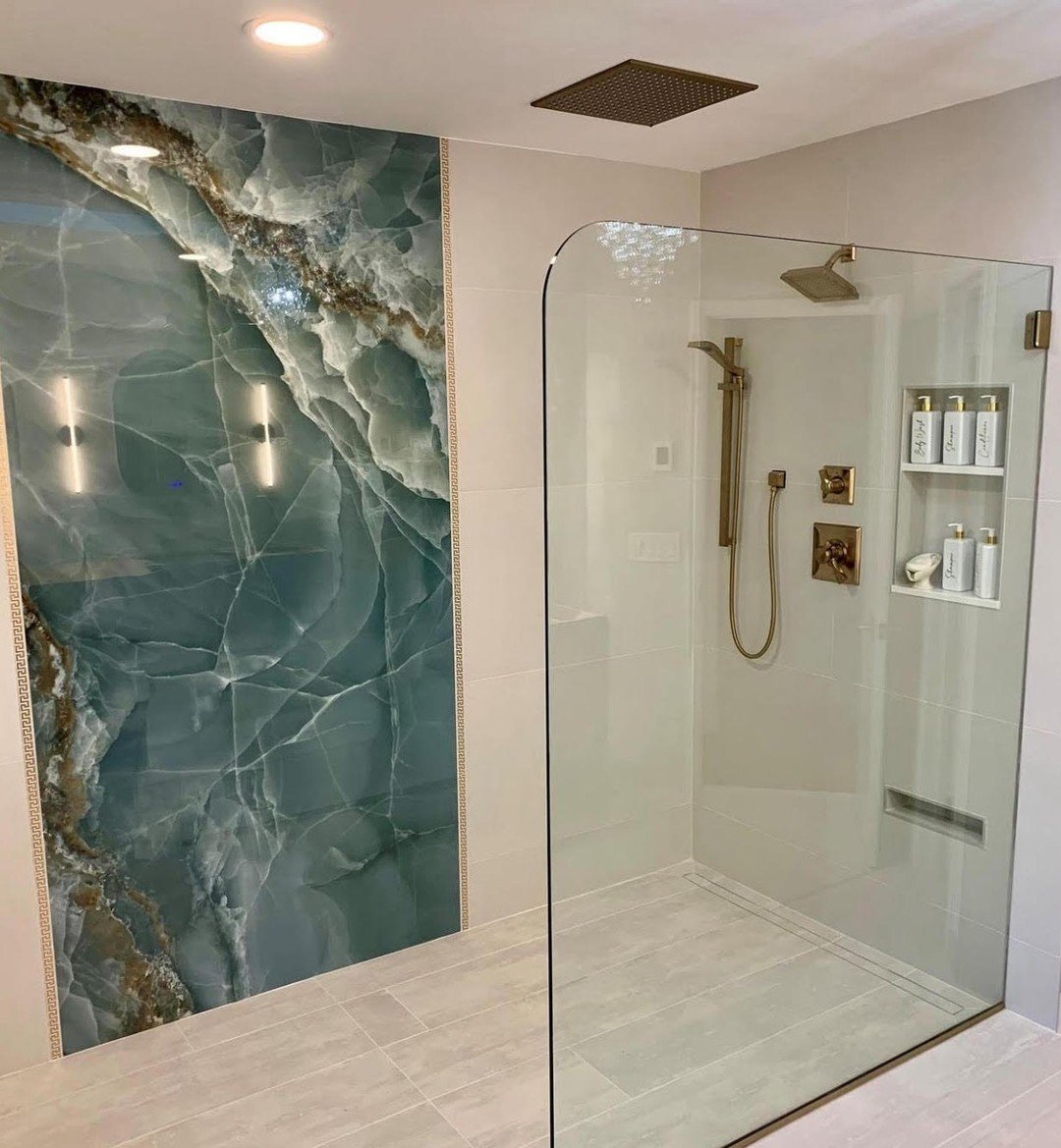 This is where tile disappears… in a good way. Large-format marble tiles create that uninterrupted, flowy look that makes the whole space feel bigger and calmer.