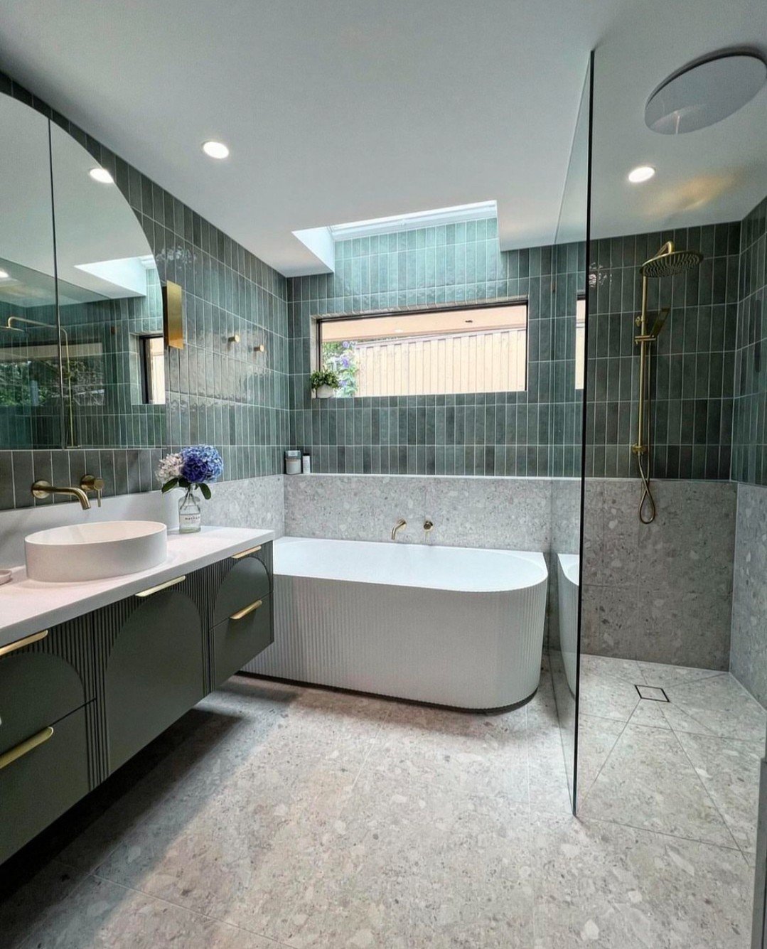 These vertically stacked green tiles bring all the spa energy. The slight variation in tone and the glossy finish make the walls feel alive, not flat.