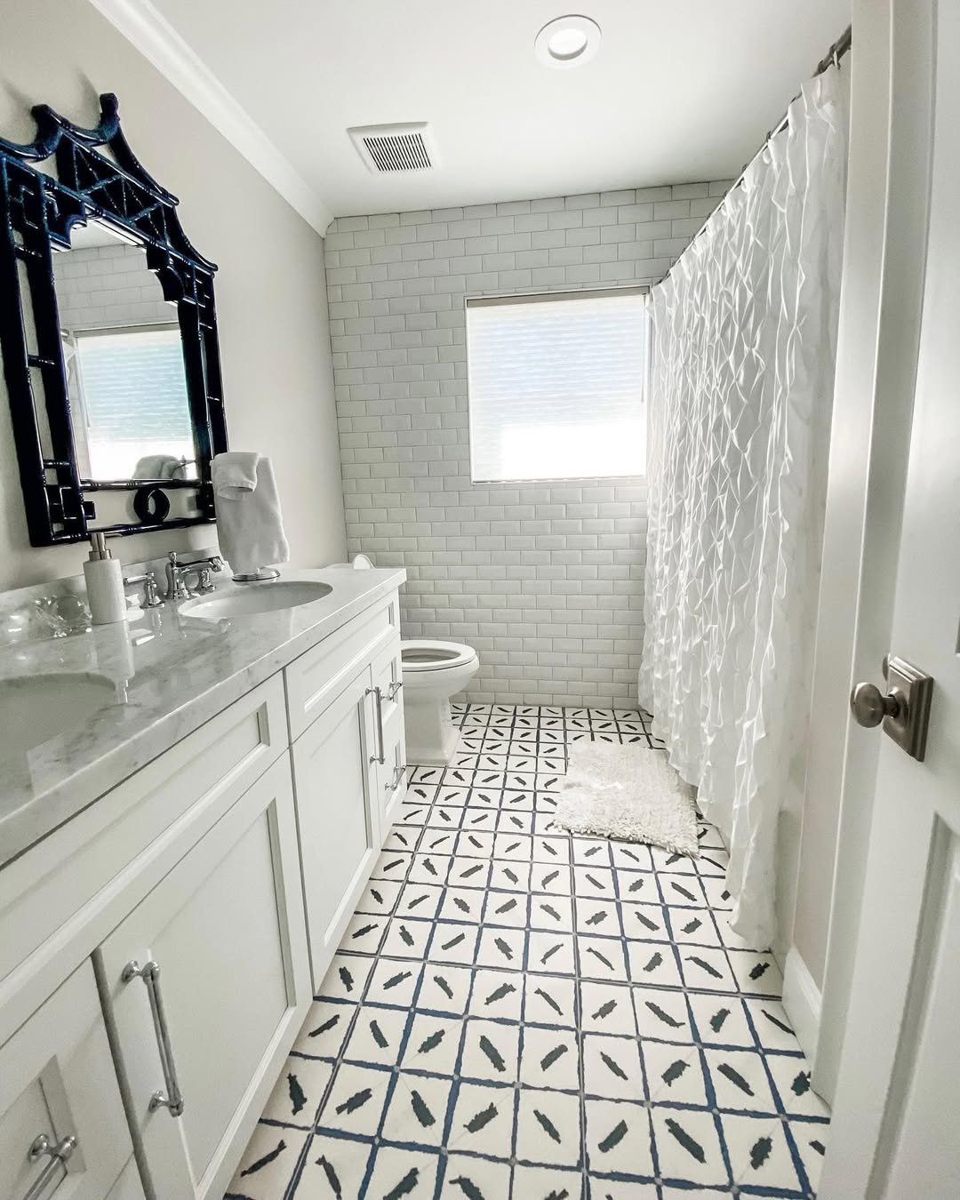 Black hex tiles on the floor, white subway on the walls—it’s a combo that just doesn’t miss. Clean, graphic, and super balanced.