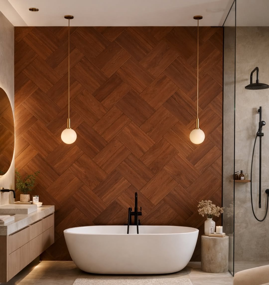 Okay, this one’s a statement. The herringbone layout with wood-look tiles brings warmth and depth, but still keeps things bathroom-appropriate.