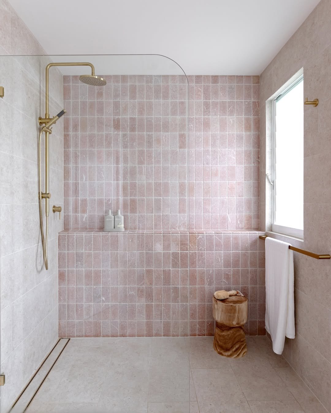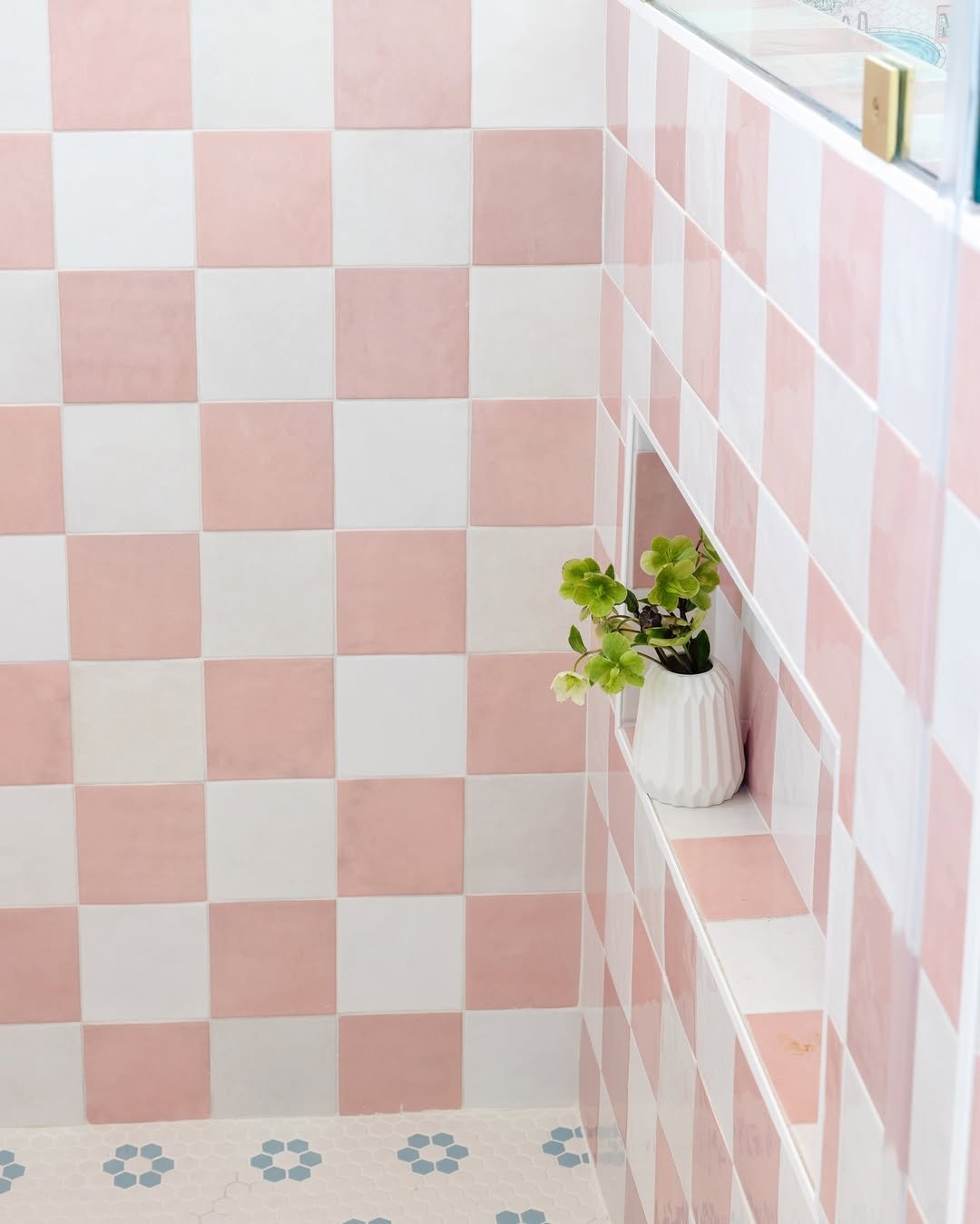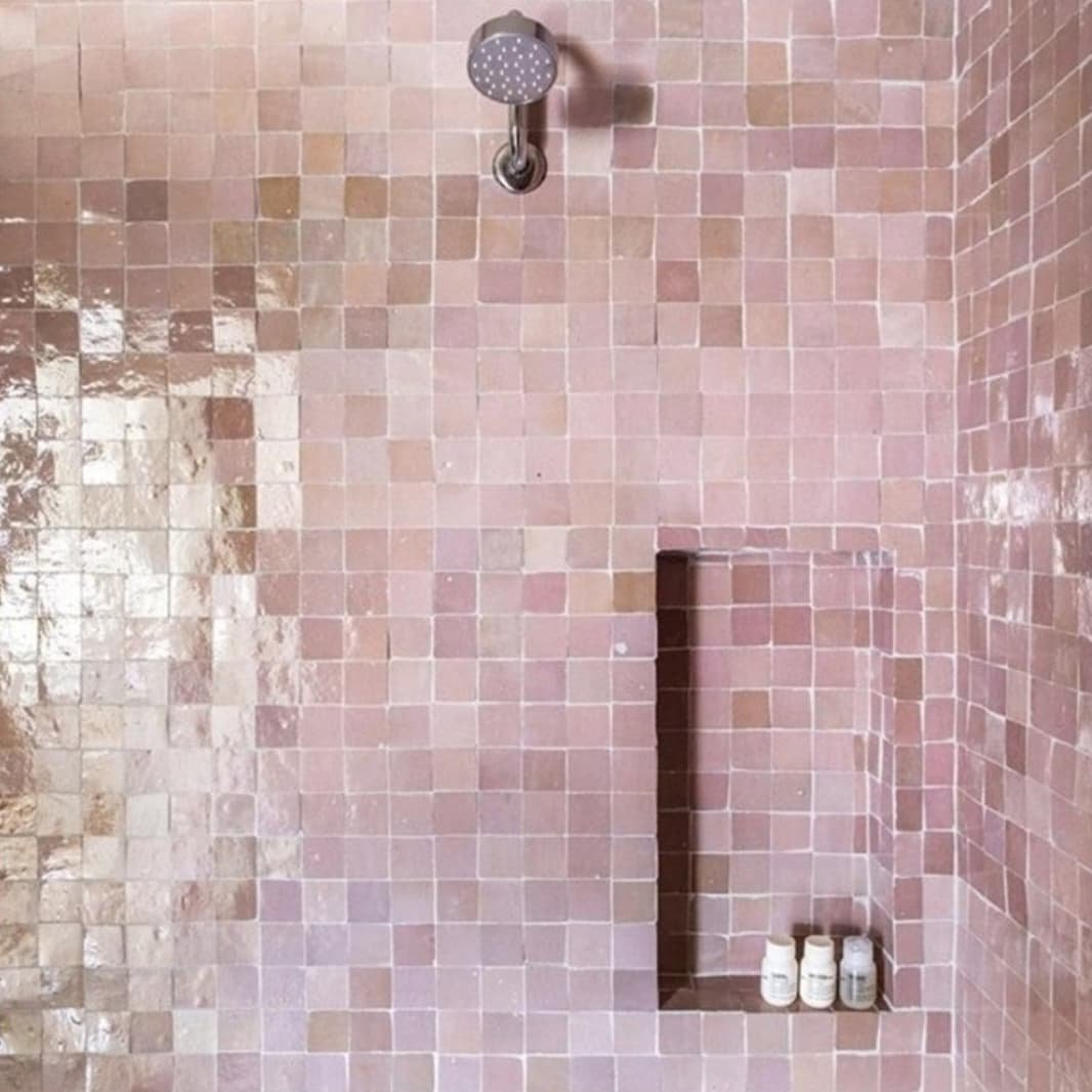 This one is all about restraint. The soft pink tiles in a clean grid layout keep things structured while still bringing warmth into the space.