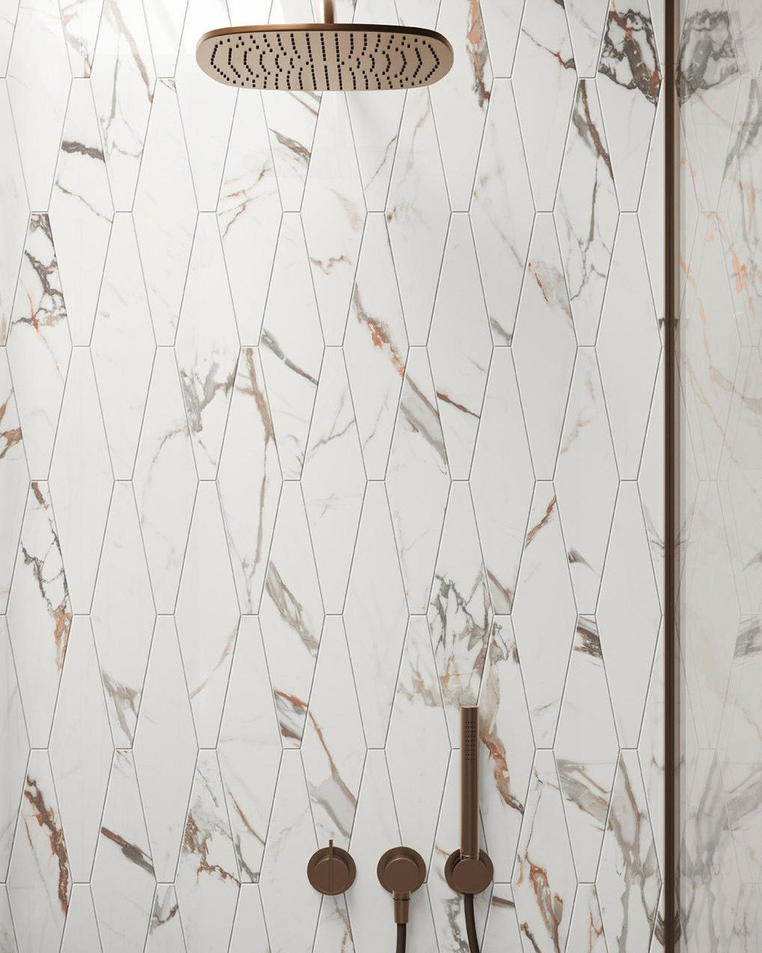 This isn’t just tile—it’s basically wall art pretending to be practical. The elongated geometric shapes paired with soft marble veining create this flowing, almost rhythmic pattern that instantly elevates the whole shower.