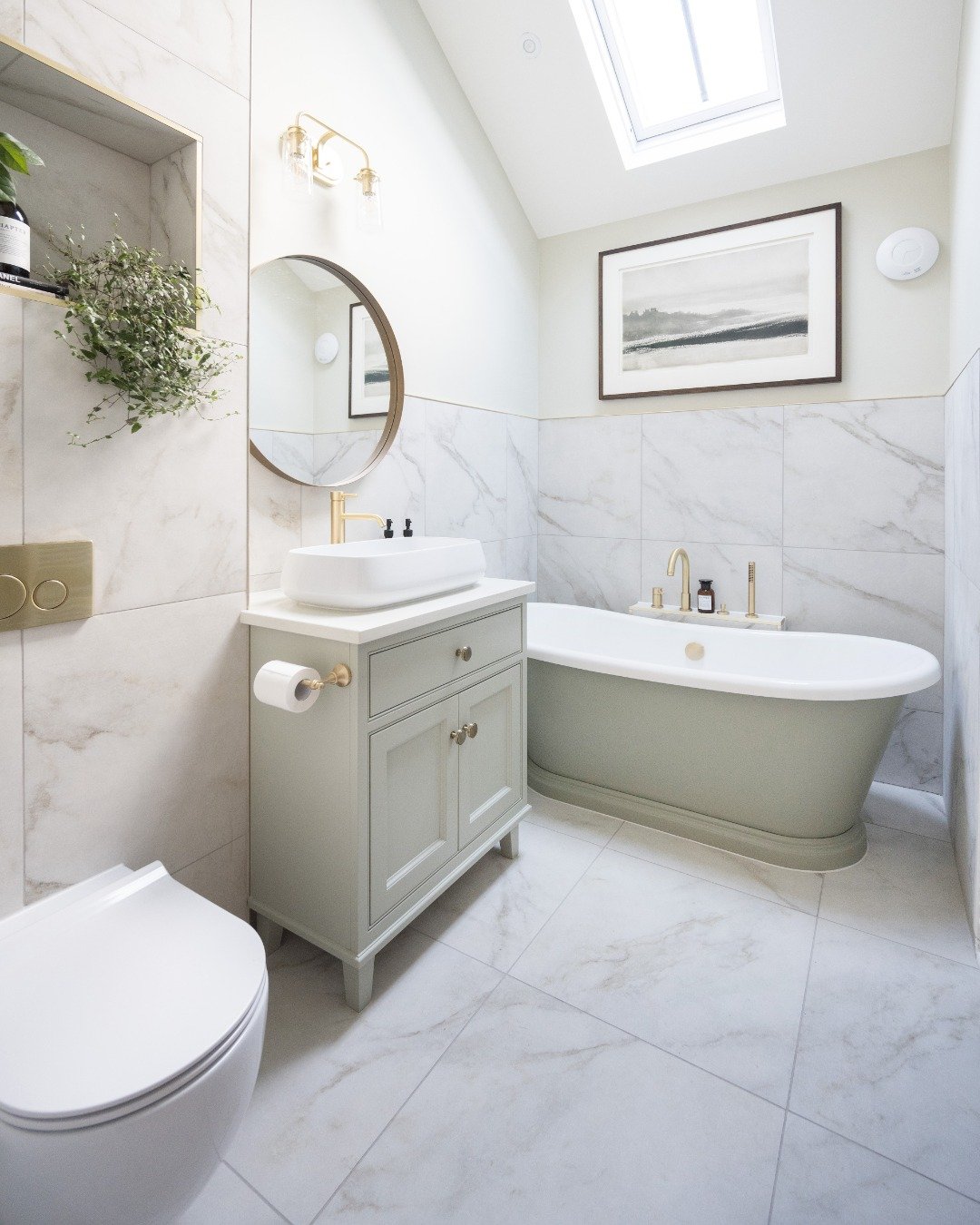 And paired with those warm brass fixtures? It’s clean, tailored, and just a little bit fancy. Like a well-fitted blazer for your bathroom.