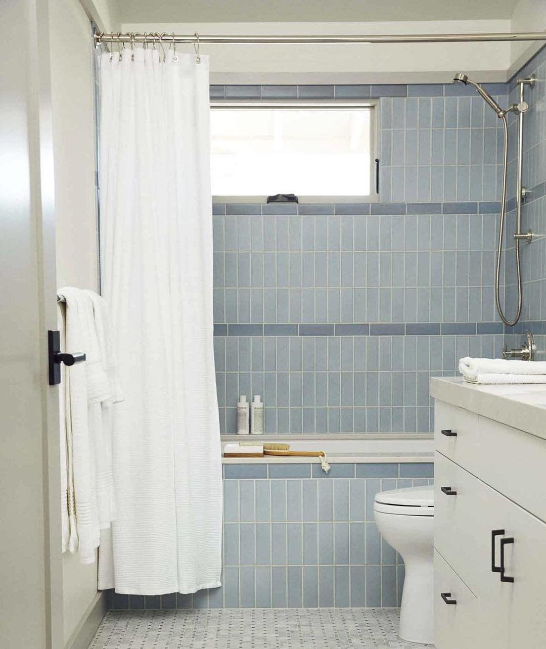 This layout leans into repetition in the best way. The vertical blue tiles create a calming rhythm that makes the space feel organized and airy at the same time.