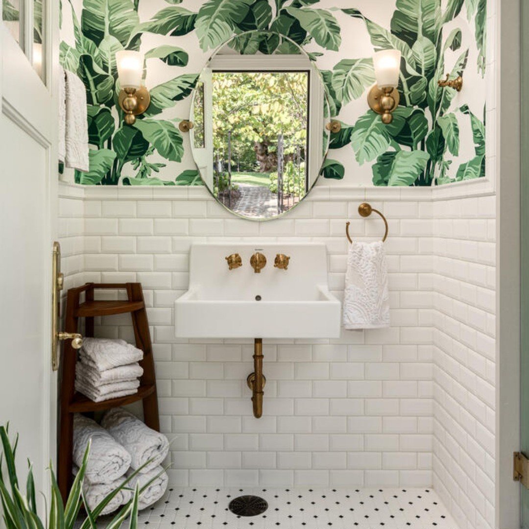 Now this is how you mix patterns. Classic white subway tile on the bottom, bold leafy wallpaper on top—it’s unexpected, but somehow perfectly balanced.