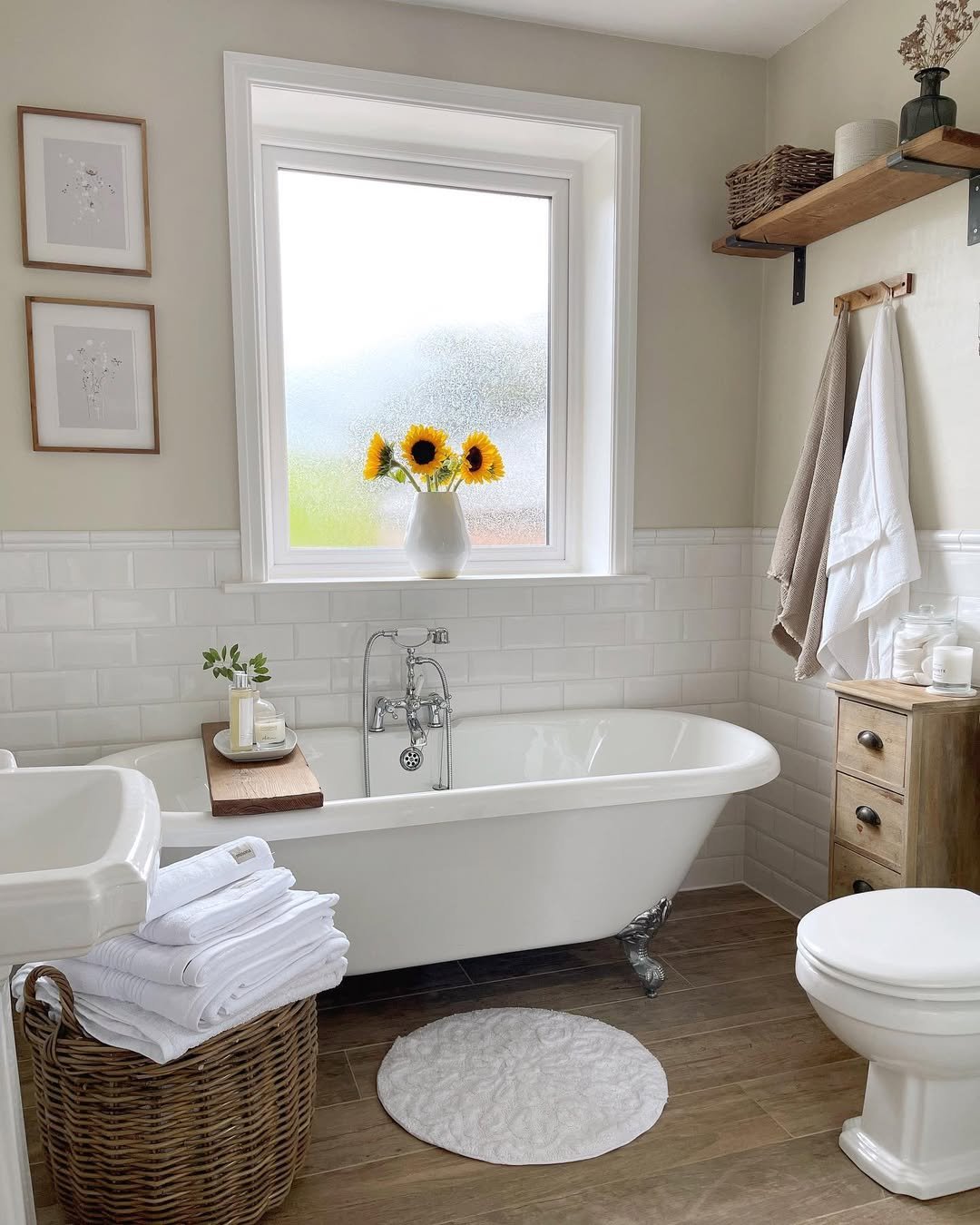 This one feels like a warm hug in bathroom form. A woven basket stacked with fluffy towels, hooks keeping the everyday ones within reach, and that soft natural light tying it all together.