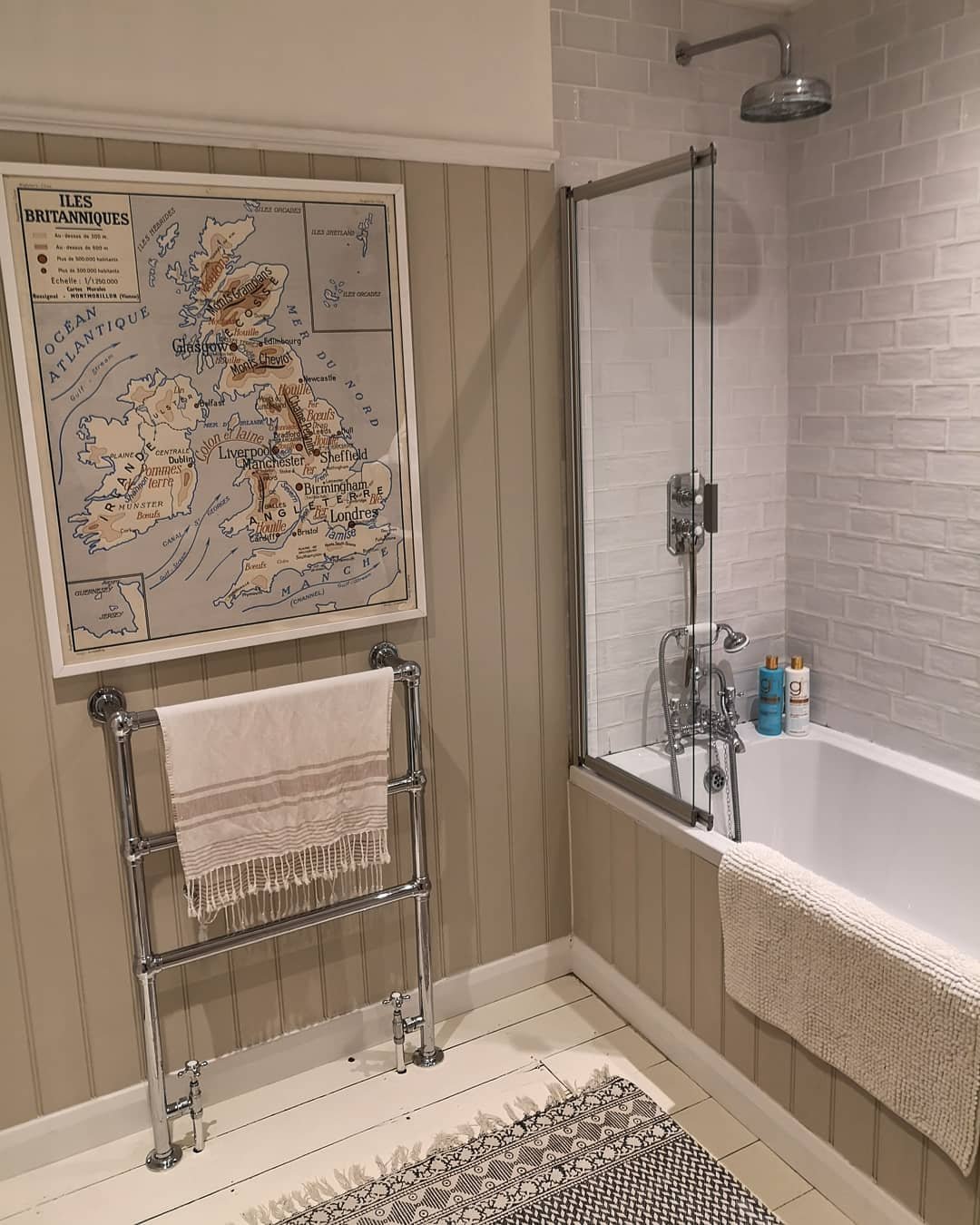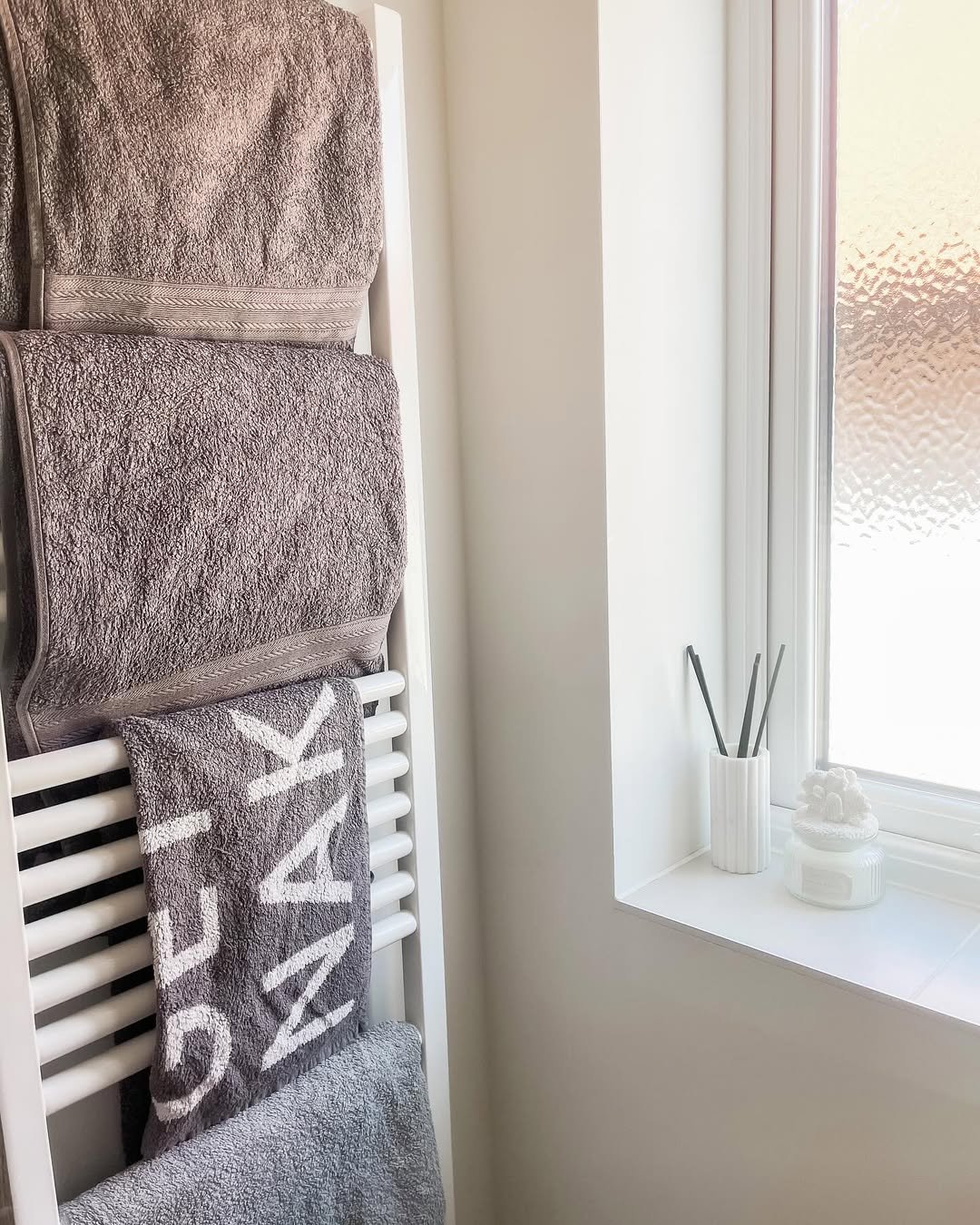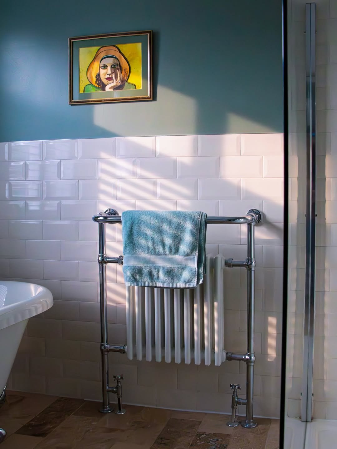 Let’s talk about using what you already have. A radiator doubles as a towel holder, keeping things warm, dry, and within easy reach.
