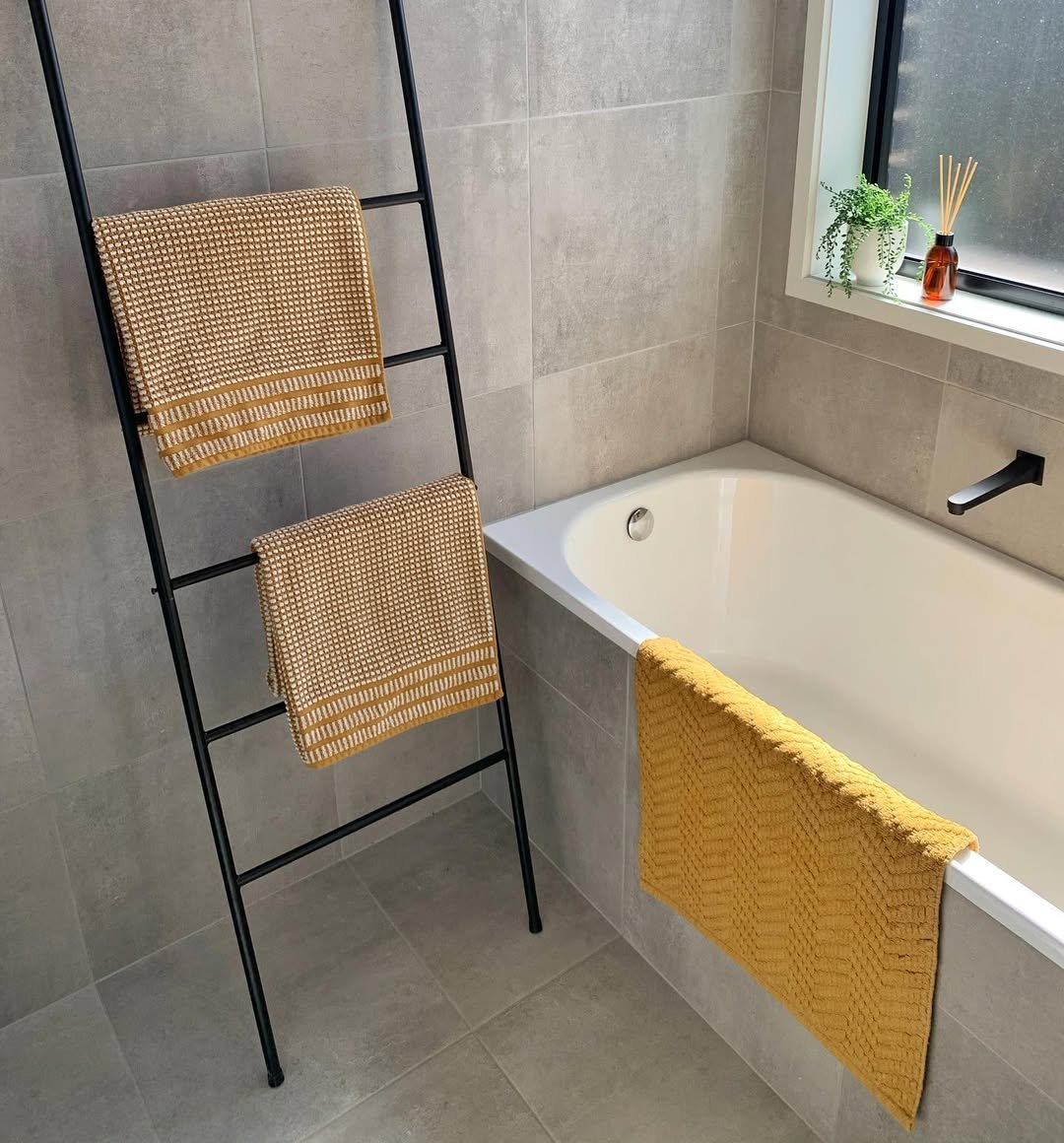 The wall-mounted ladder rack is one of those ideas that instantly elevates a space. Towels draped instead of folded? Effortlessly chic.