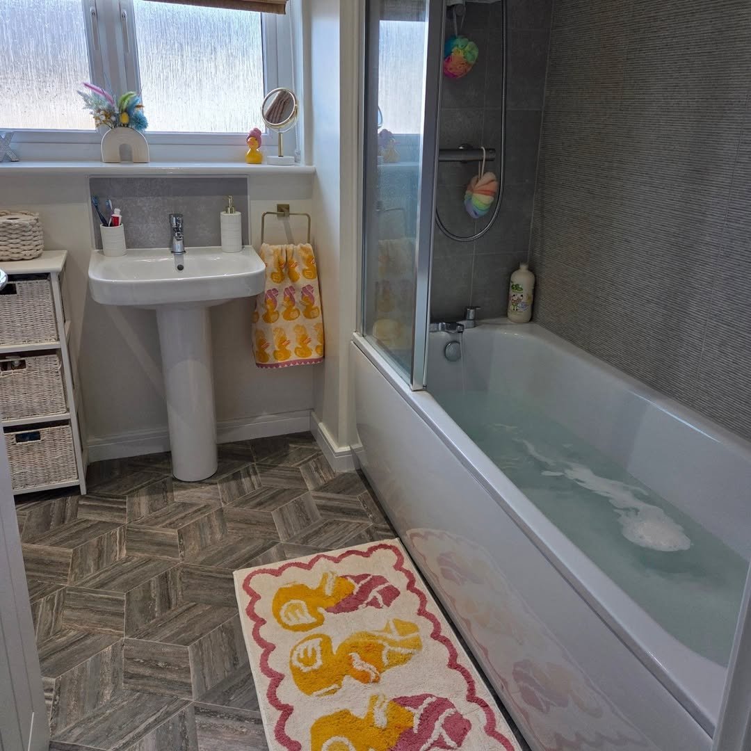 It’s relaxed, practical, and visually warm. The kind of setup that makes a bath feel less like a routine and more like a small escape.