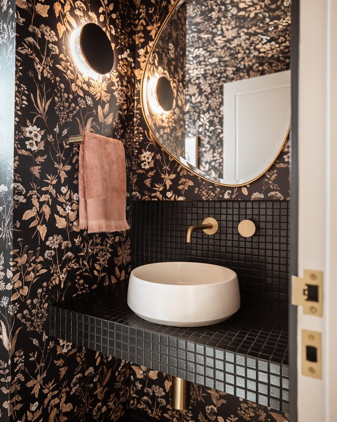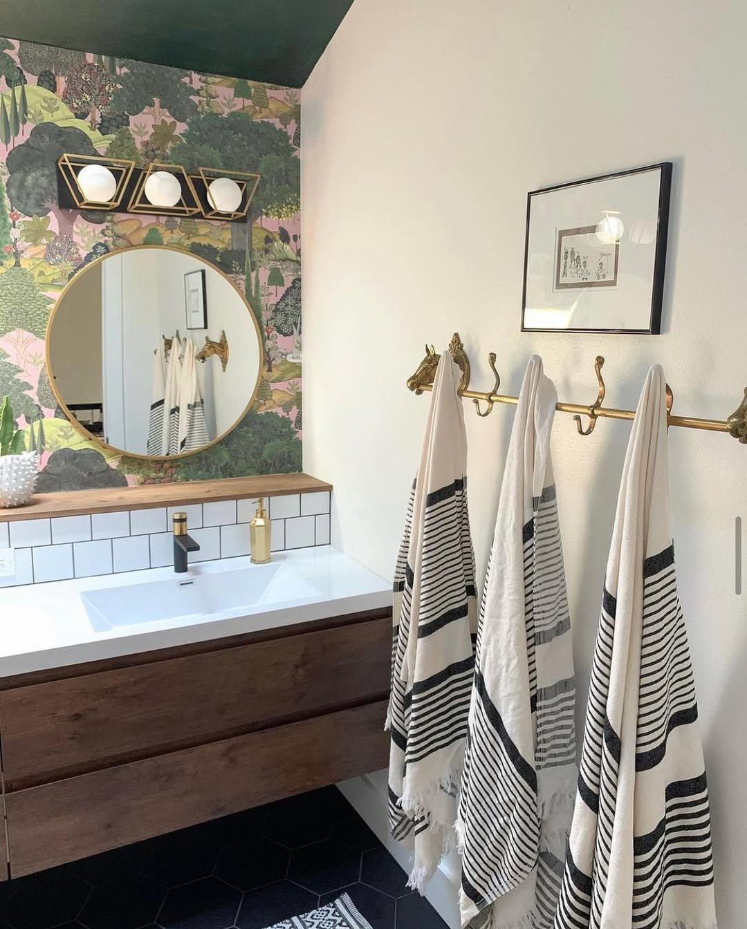 This is not your average towel setup—and that’s exactly why it works. A simple bar, but surrounded by bold wallpaper and warm lighting that makes everything feel rich and layered.